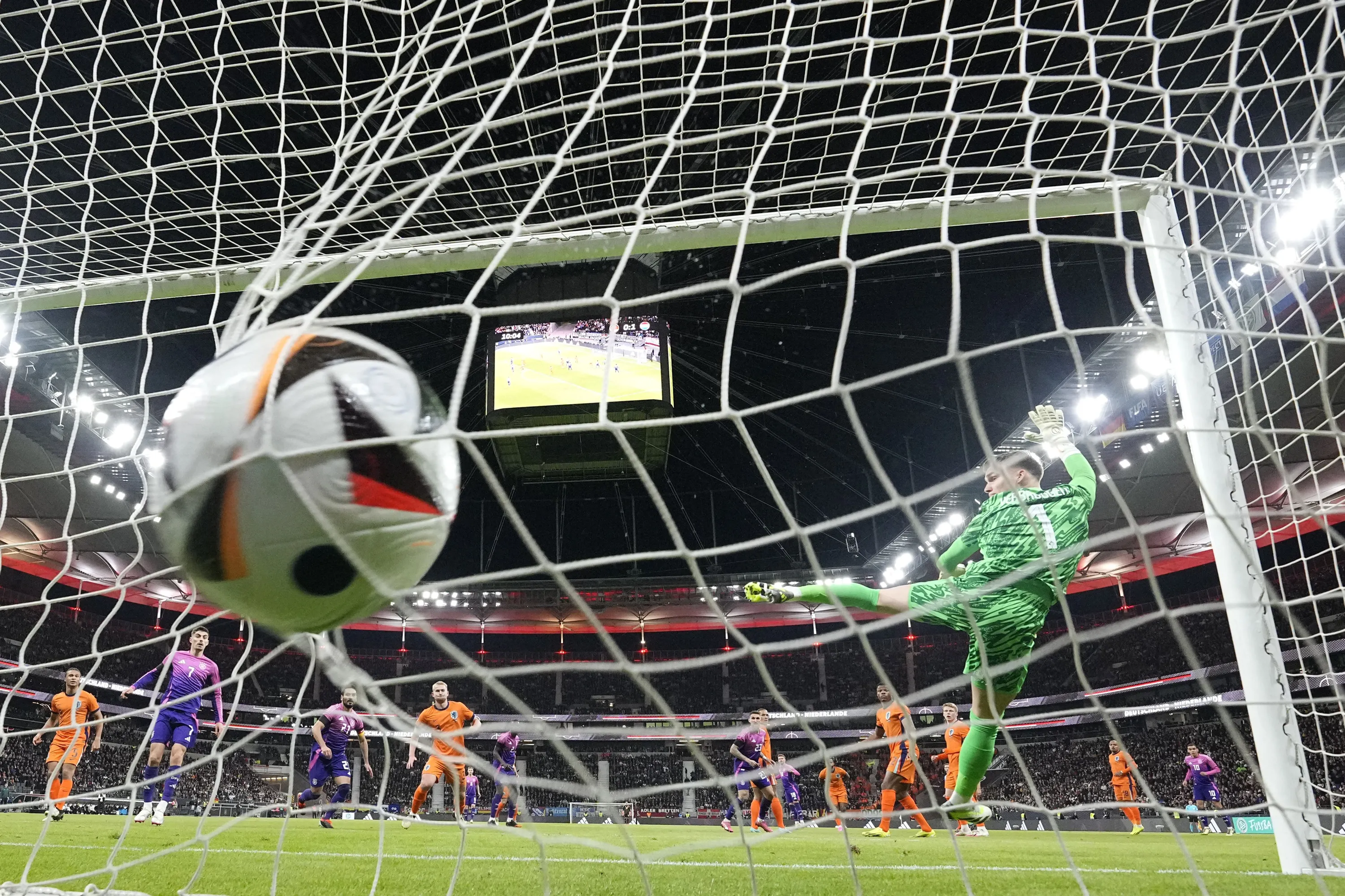 Netherlands' goalkeeper Bart Verbruggen fails to make a save during the international friendly soccer match between Germany and Netherlands at the Deutsche Bank Park in Frankfurt, Germany on Tuesday, March 26, 2024. (Photo by Martin Meissner/AP Photo)