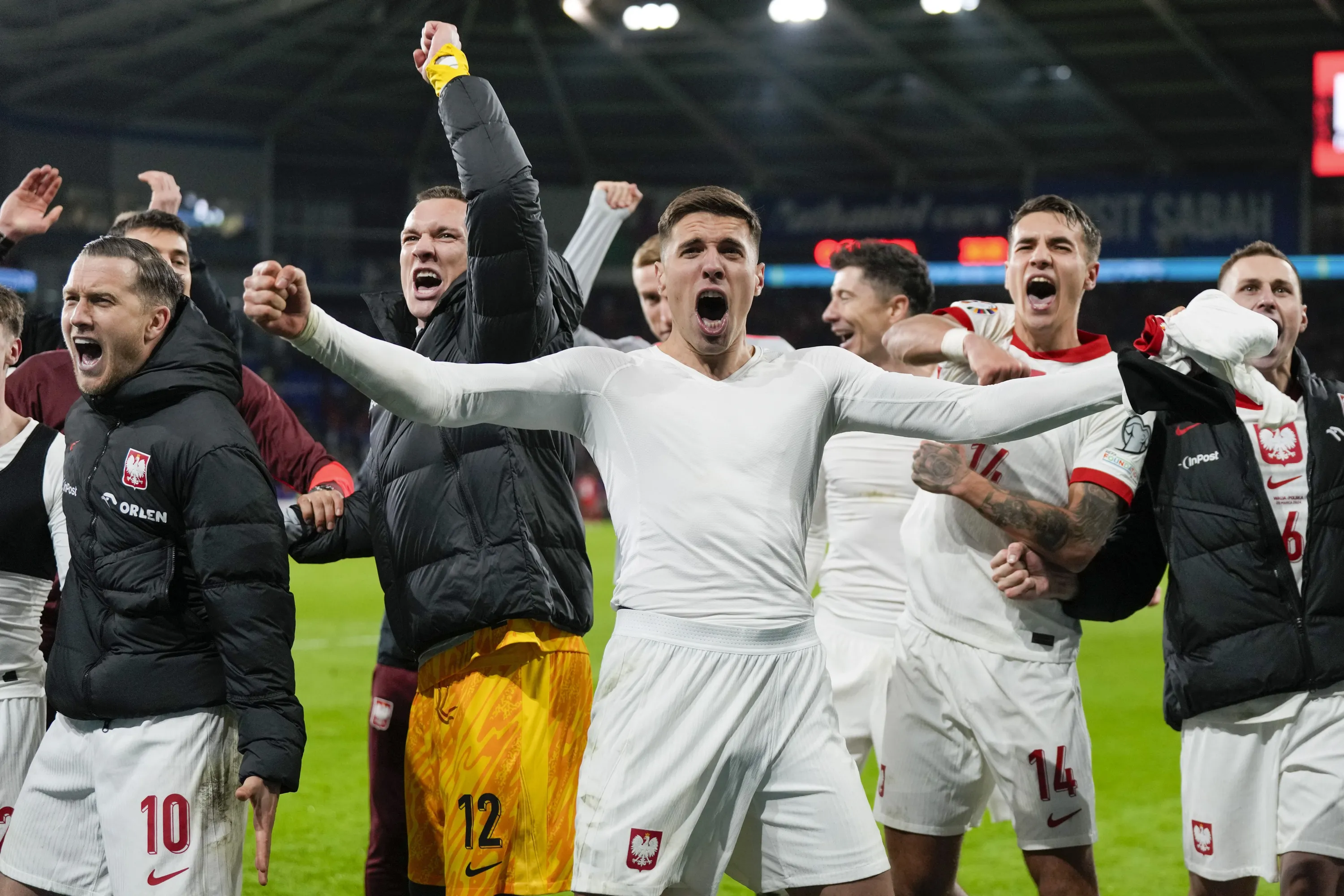 Poland players celebrate after defeating Wales in a penalty shoot out during their Euro 2024 soccer play-off match at Cardiff City Stadium, Wales, Tuesday, March 26, 2024. (Photo by Alastair Grant/AP Photo)