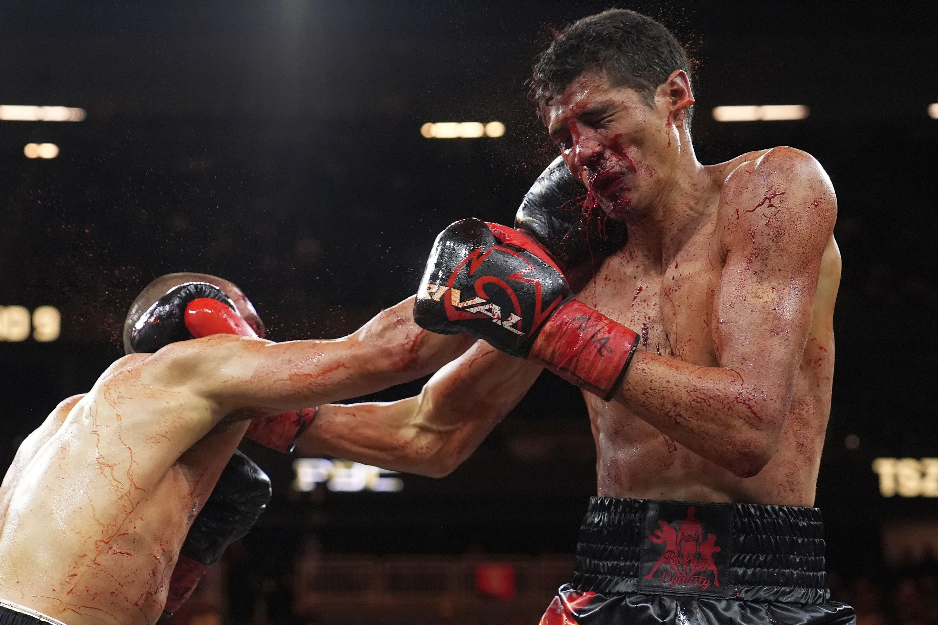 Tim Tszyu, of Australia, hits Sebastian Fundora in a super welterweight title bout Saturday, March 30, 2024, in Las Vegas. (Photo by John Locher/AP Photo)