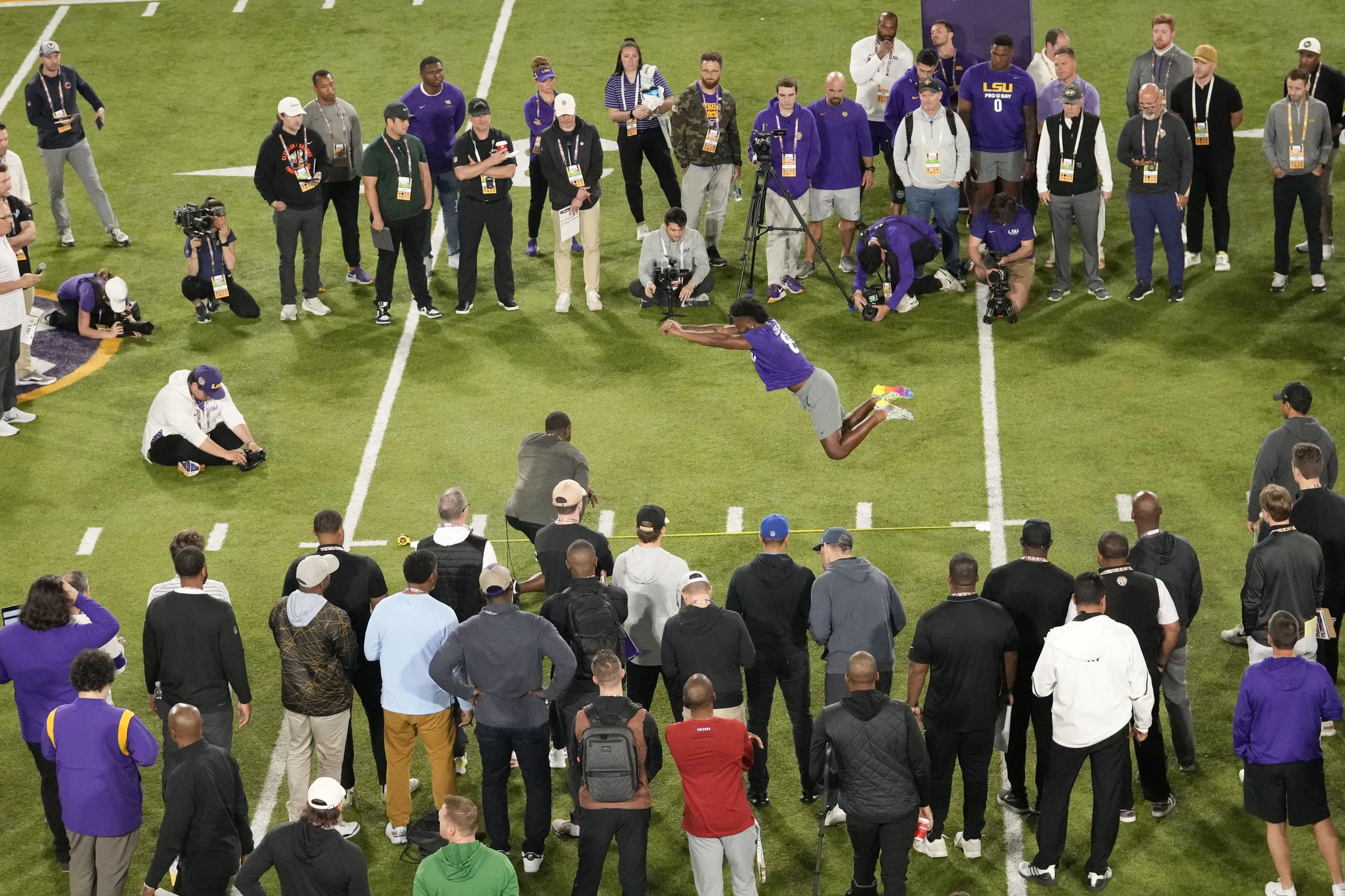 LSU wide receiver Gregory Clayton Jr. performs the broad jump during LSU's NCAA football pro day in Baton Rouge, La., Wednesday, March 27, 2024. (Photo by Gerald Herbert/AP Photo)
