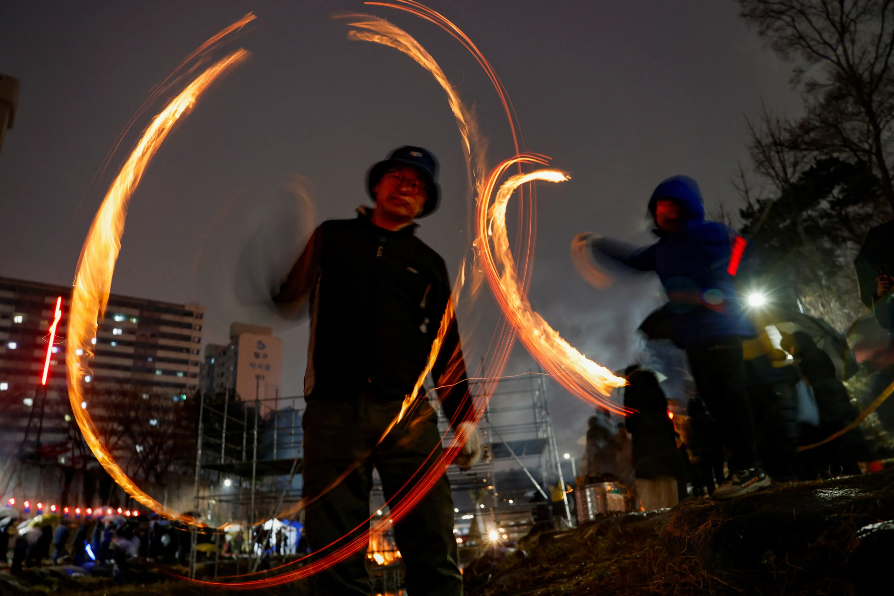 People whirl cans filled with burning wood chips during a celebration ahead of “Jeongwol Daeboreum” (Great Full Moon), the first full moon in the Korean lunar calendar in Seoul, South Korea, on February 24, 2024. (Photo by Kim Soo-Hyeon/Reuters)