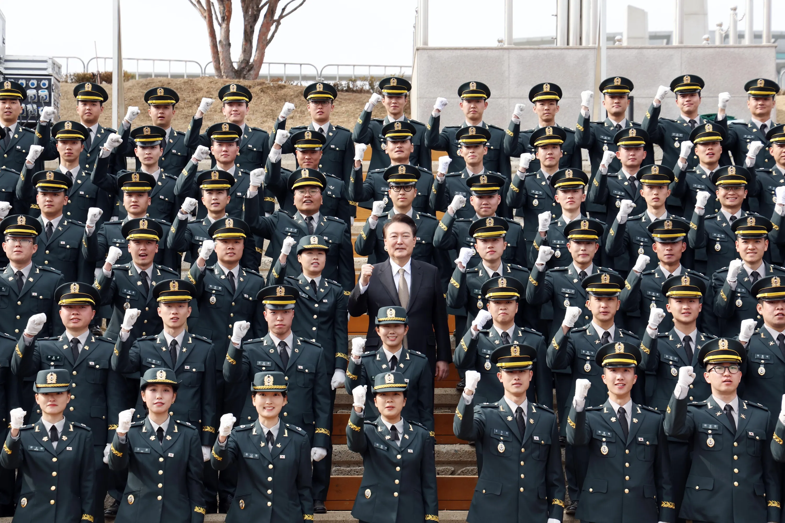 South Korean President Yoon Suk Yeol (C, 3rd row) poses for a photo with Reserved Officer Training Corps cadets during their commissioning ceremony at the Army Cadet Military School in Goesan, South Korea, 28 February 2024. (Photo by Yonhap/EPA/EFE)