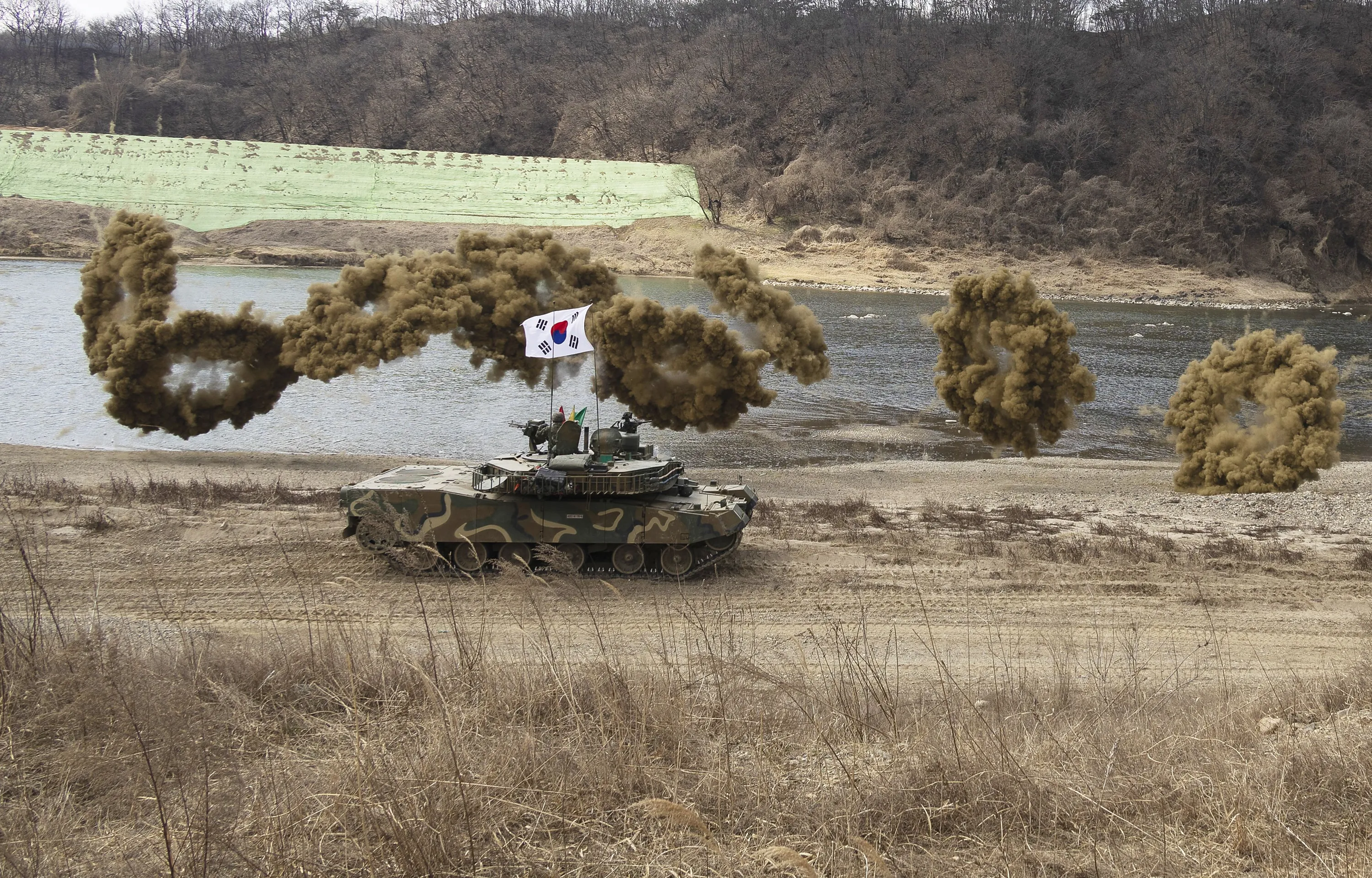 A South Korean K1E1 tank participates as South Korean and US soldiers conduct a joint river-crossing exercise in Yeoncheon, Gyeonggi province, South Korea, 20 March 2024. (Photo by Jeon Heon-Kyun/EPA)