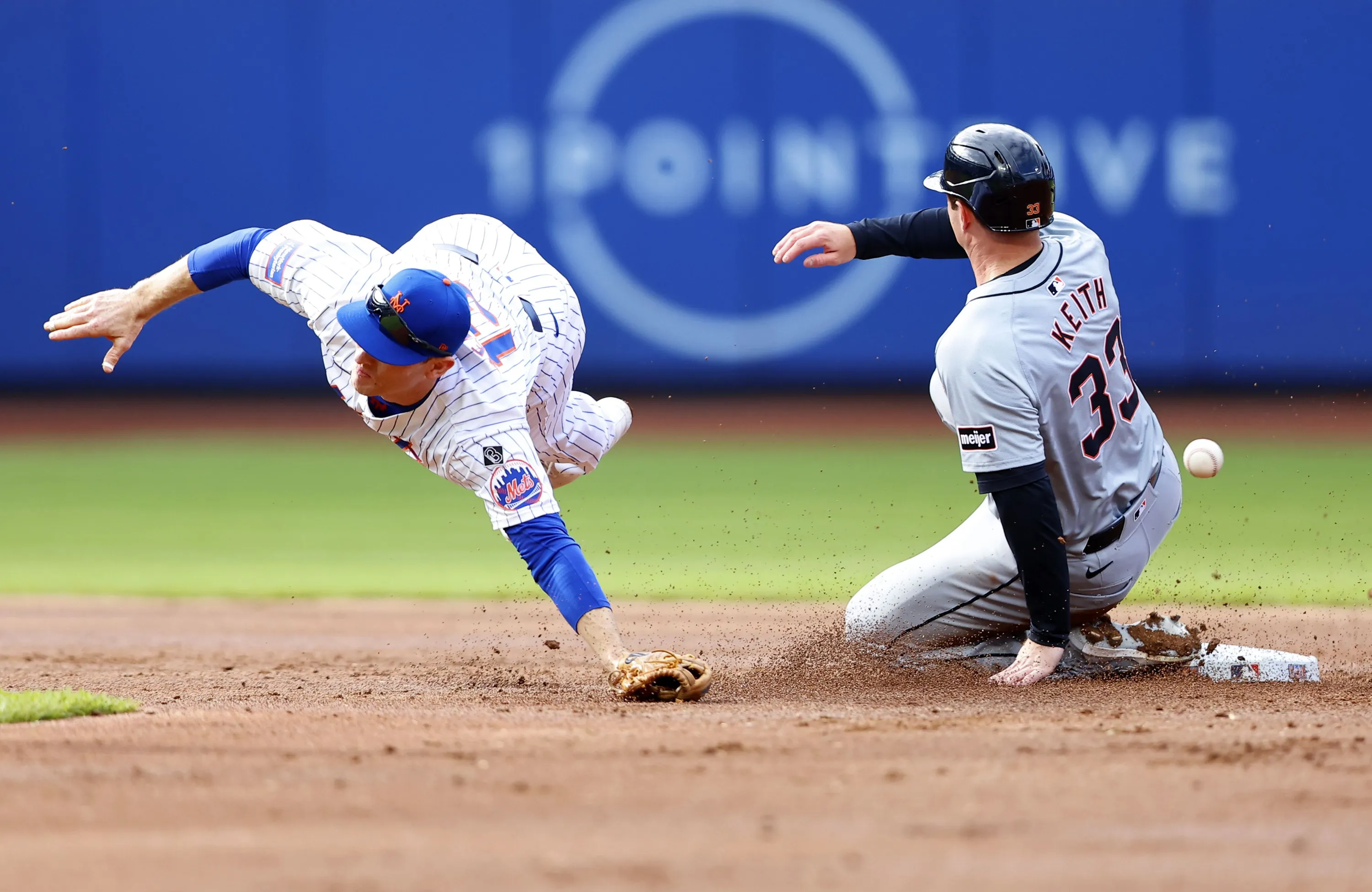 Detroit Tigers Colt Keith (33) steals second base as New York Mets shortstop Joey Wendle, left, is unable to handle the throw during the second inning in the second baseball game of a doubleheader, Thursday, April 4, 2024, in New York. (Photo by Noah K. Murray/AP Photo)