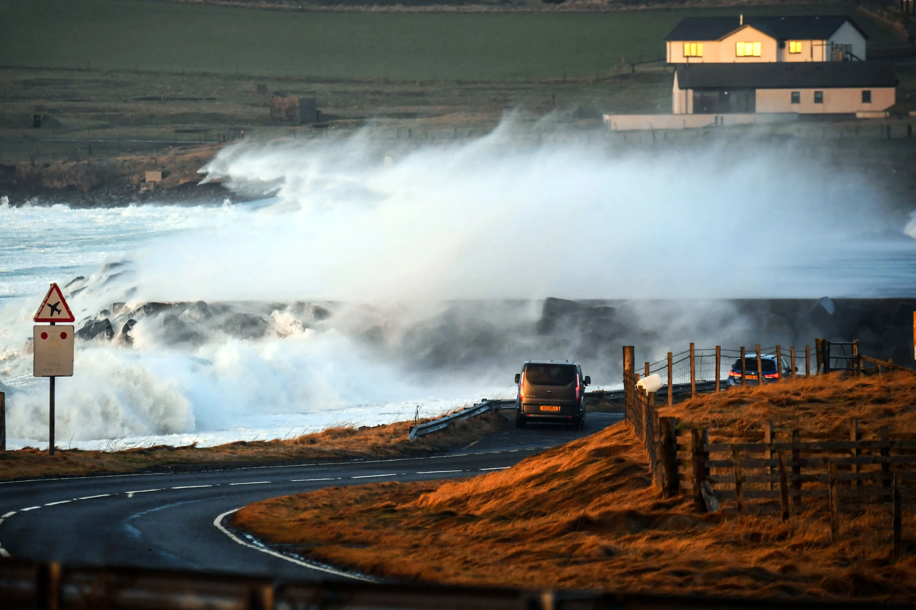 Waves break over the end of the runway at Sumburgh Airport in Sumburgh, Shetland Islands, on January 31, 2024, as severe weather from Storm Ingunn affects flights and ferry travel. (Photo by Andy Buchanan/AFP Photo)
