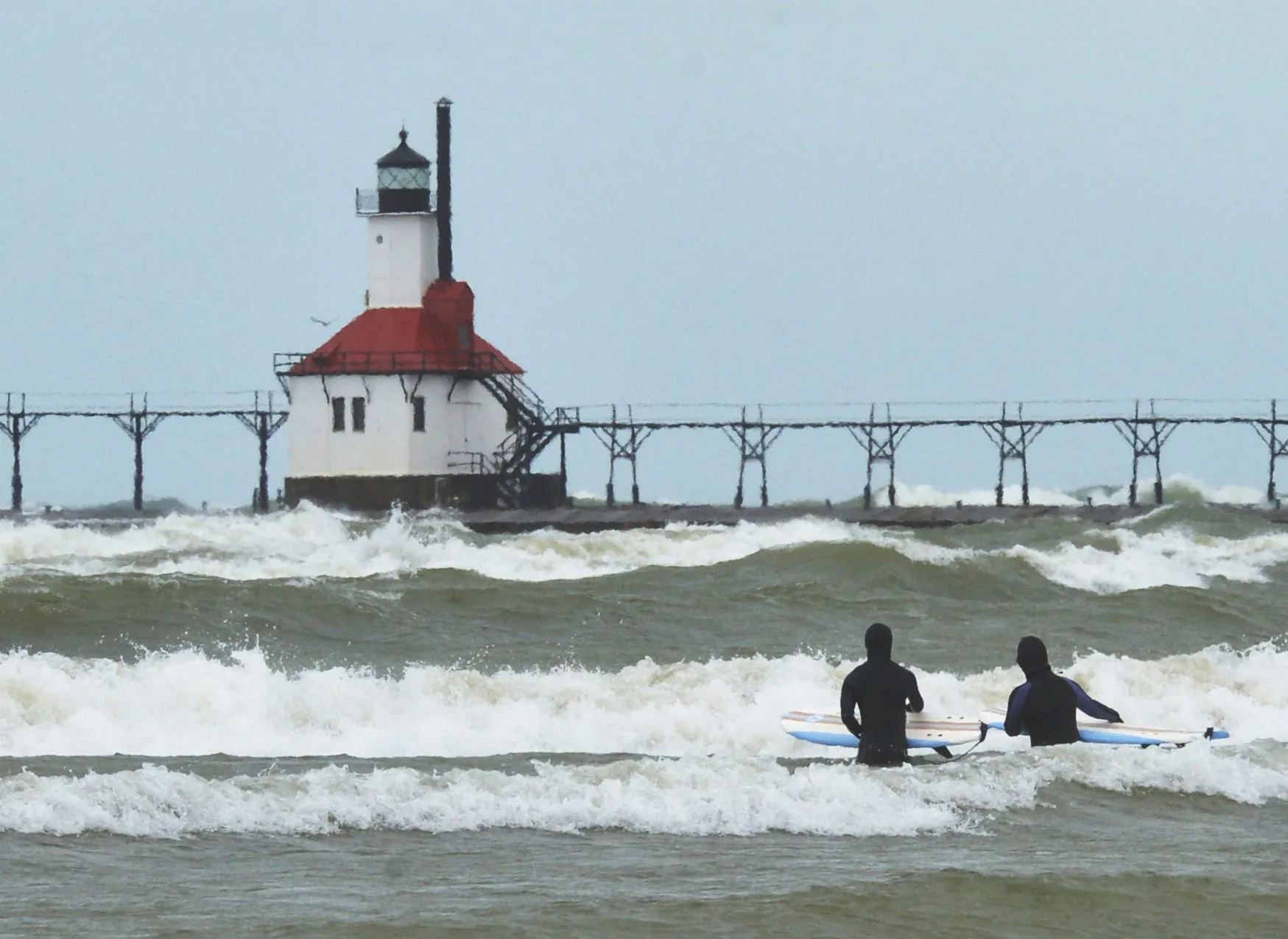 Winter returns to Southwest Michigan Wednesday, February 28, 2024, as surfers brave cold and windy conditions along Lake Michigan in St. Joseph, Mich. (Photo by Don Campbell/AP Photo)