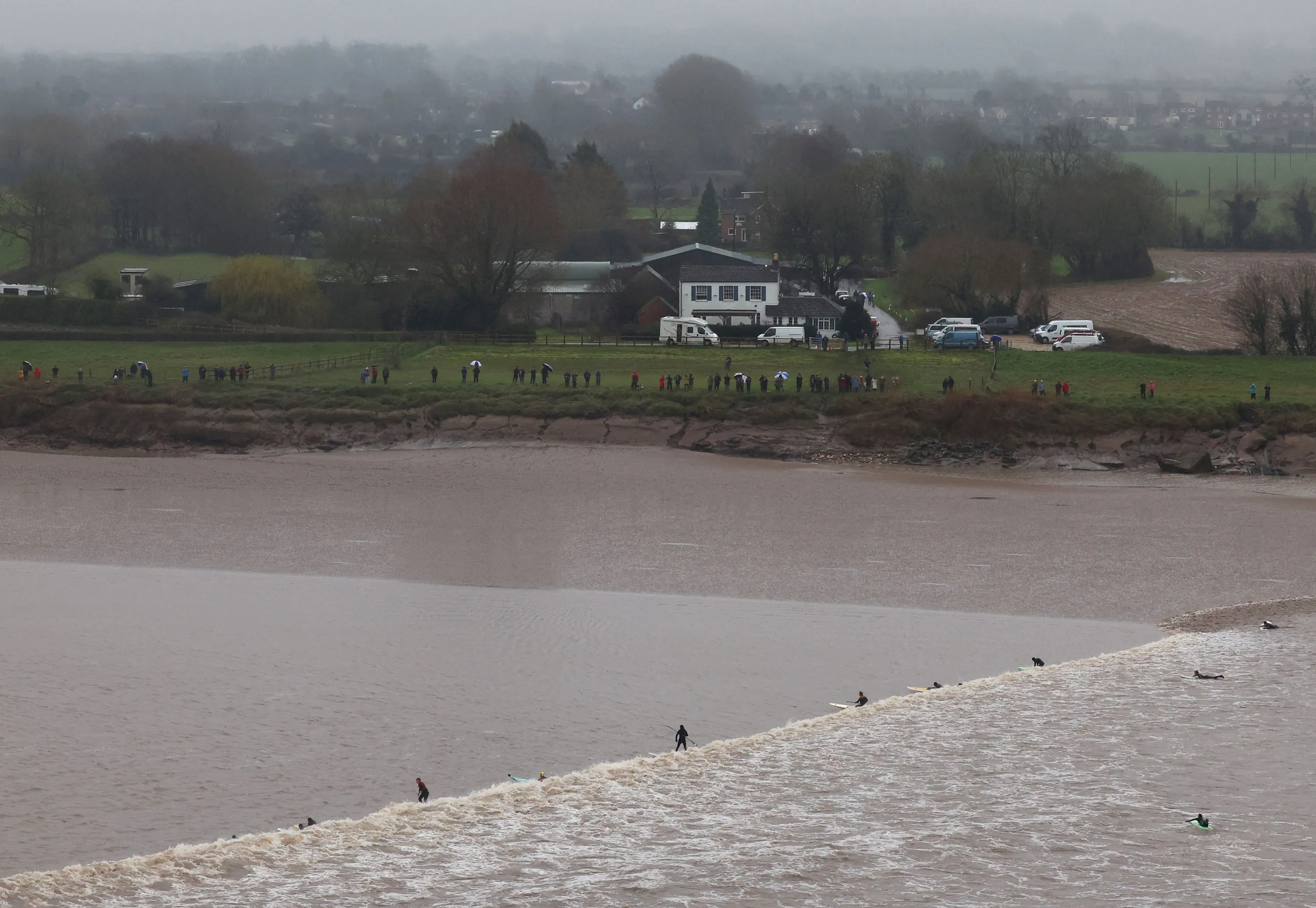 Surfers and kayakers ride the Severn Bore surge wave, a natural phenomenon occurring according to the lunar cycle where a set of waves push through the Severn River estuary and upstream on a high tide, on the only day in 2024 where it is given a five star size status, at Newnham, near Gloucester in Britain on March 12, 2024. (Photo by Toby Melville/Reuters)