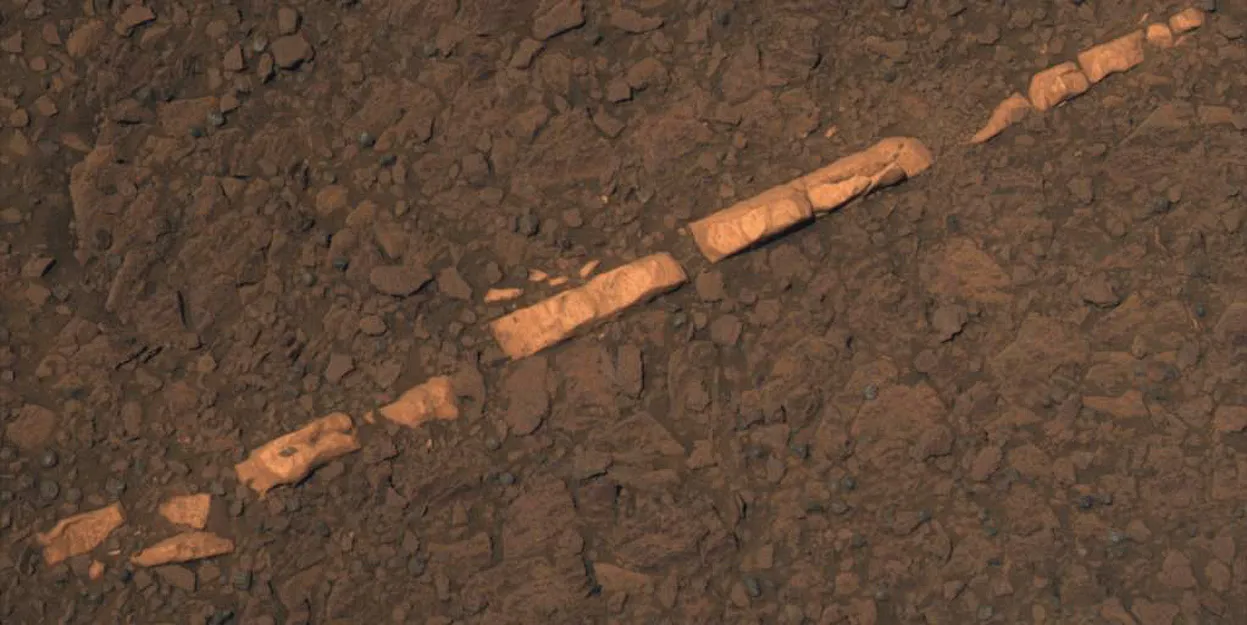 This color view taken November 7, 2011 of a mineral vein called “Homestake” comes from the Pancam on Opportunity, taken on December 7, 2011. The vein is about the width of a thumb and about 18 inches (45 centimeters) long. Opportunity examined it in November 2011 and found it to be rich in calcium and sulfur, possibly the calcium-sulfate mineral gypsum. Homestake is near the edge of the “Cape York” segment of the western rim of Endeavour Crater. The view is presented in approximate true color. (Photo by Reuters/NASA/JPL-Caltech/Cornell/ASU via The Atlantic)
