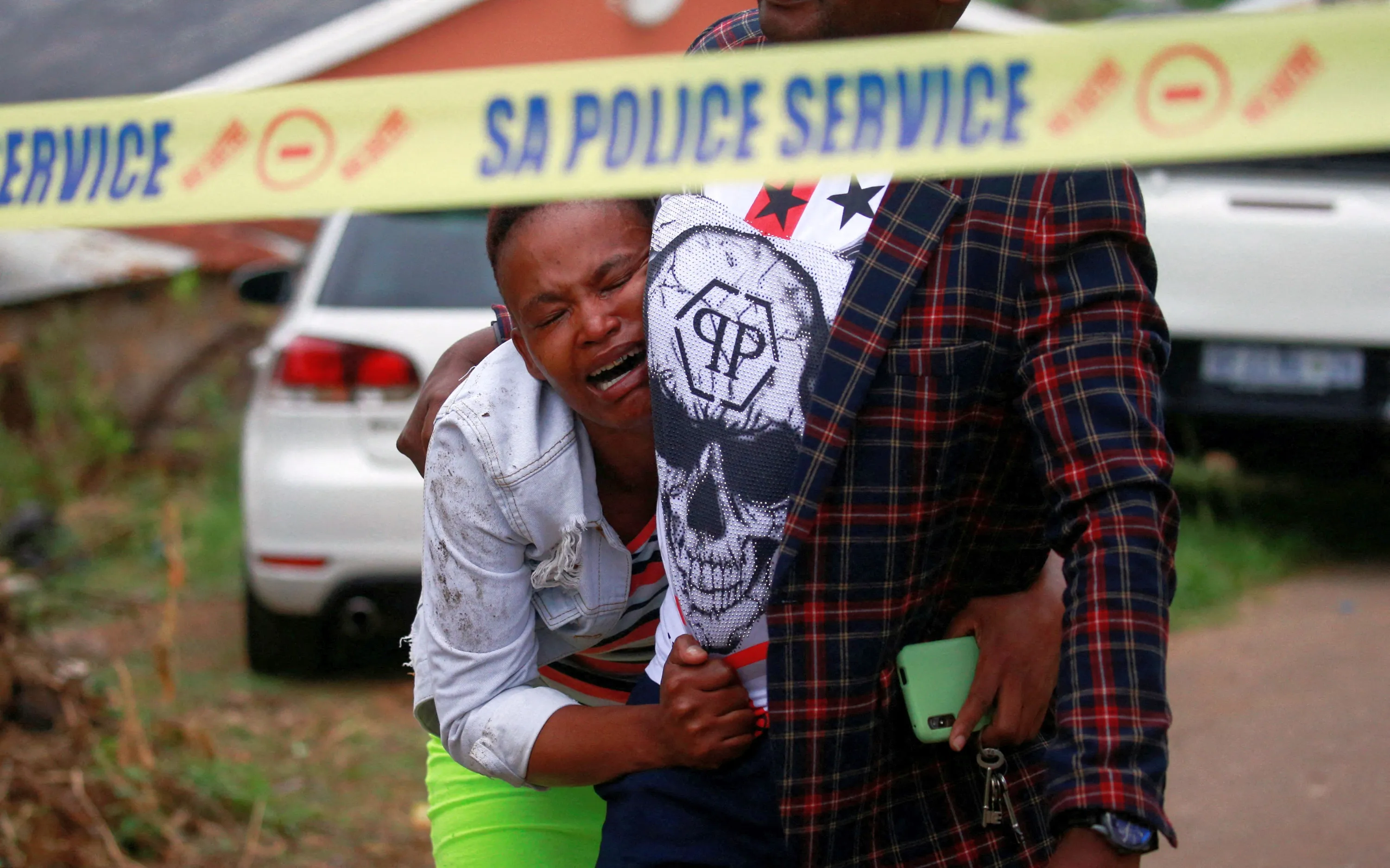 A woman reacts after identifying the body of a family member killed during a police raid on suspected criminals in Marianhill near Durban, South Africa on April 3, 2024. (Photo by Rogan Ward/Reuters)
