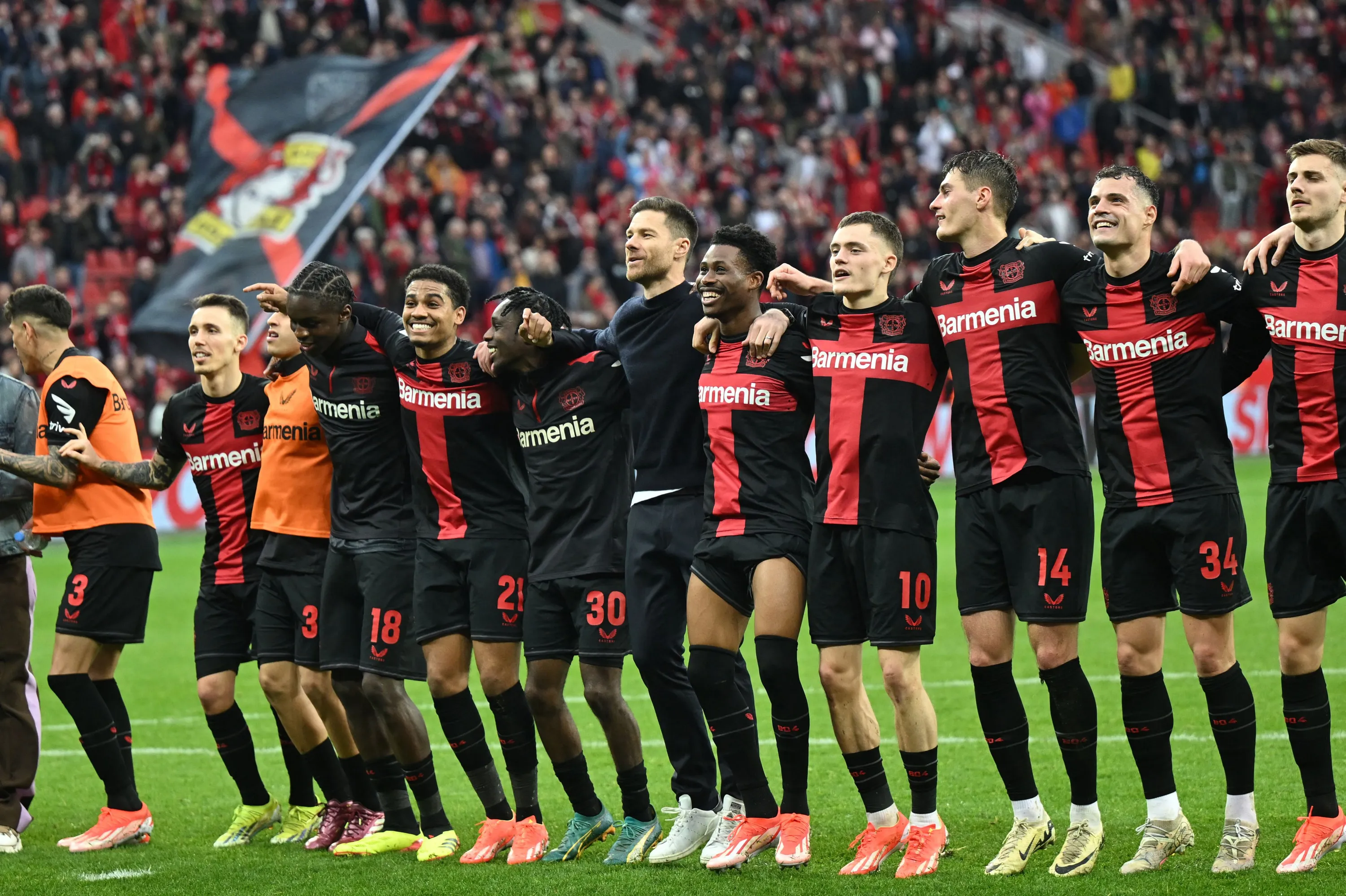 Bayer Leverkusen's Spanish head coach Xabi Alonso (C) and his players celebrate winning the German first division Bundesliga football match Bayer 04 Leverkusen v TSG 1899 Hoffenheim in Leverkusen, western Germany on March 30, 2024. (Photo by Ina Fassbender/AFP Photo)
