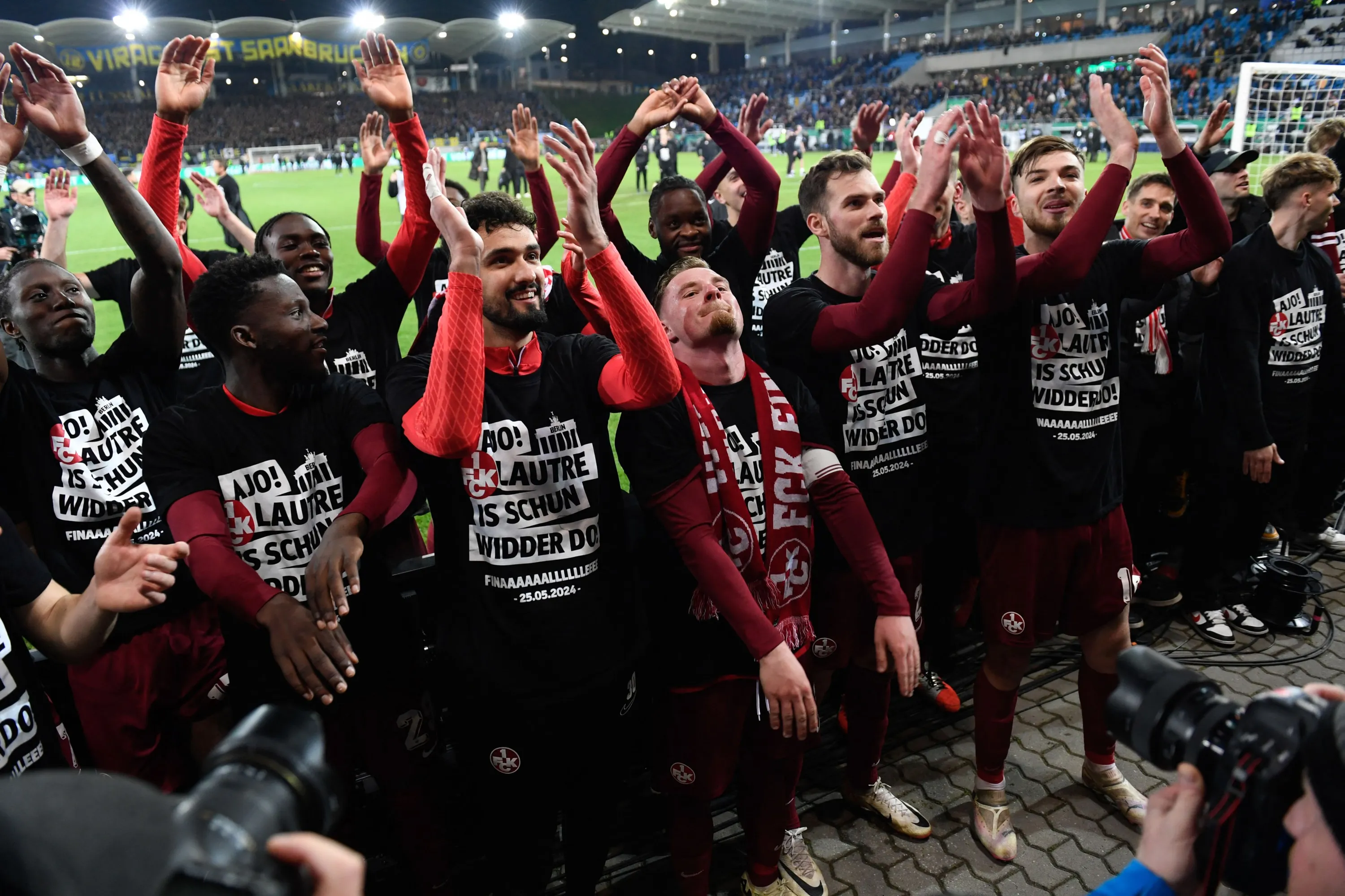 Kaiserslautern's players celebrate their team's 2-0 win with fans after the German Cup (DFB Pokal) semi-final football match between 1 FC Saarbruecken and 1 FC Kaiserslautern at the Ludwigsparkstadion in Saarbruecken, western Germany on April 2, 2024. (Photo by Jean-Christophe Verhaegen/AFP Photo)