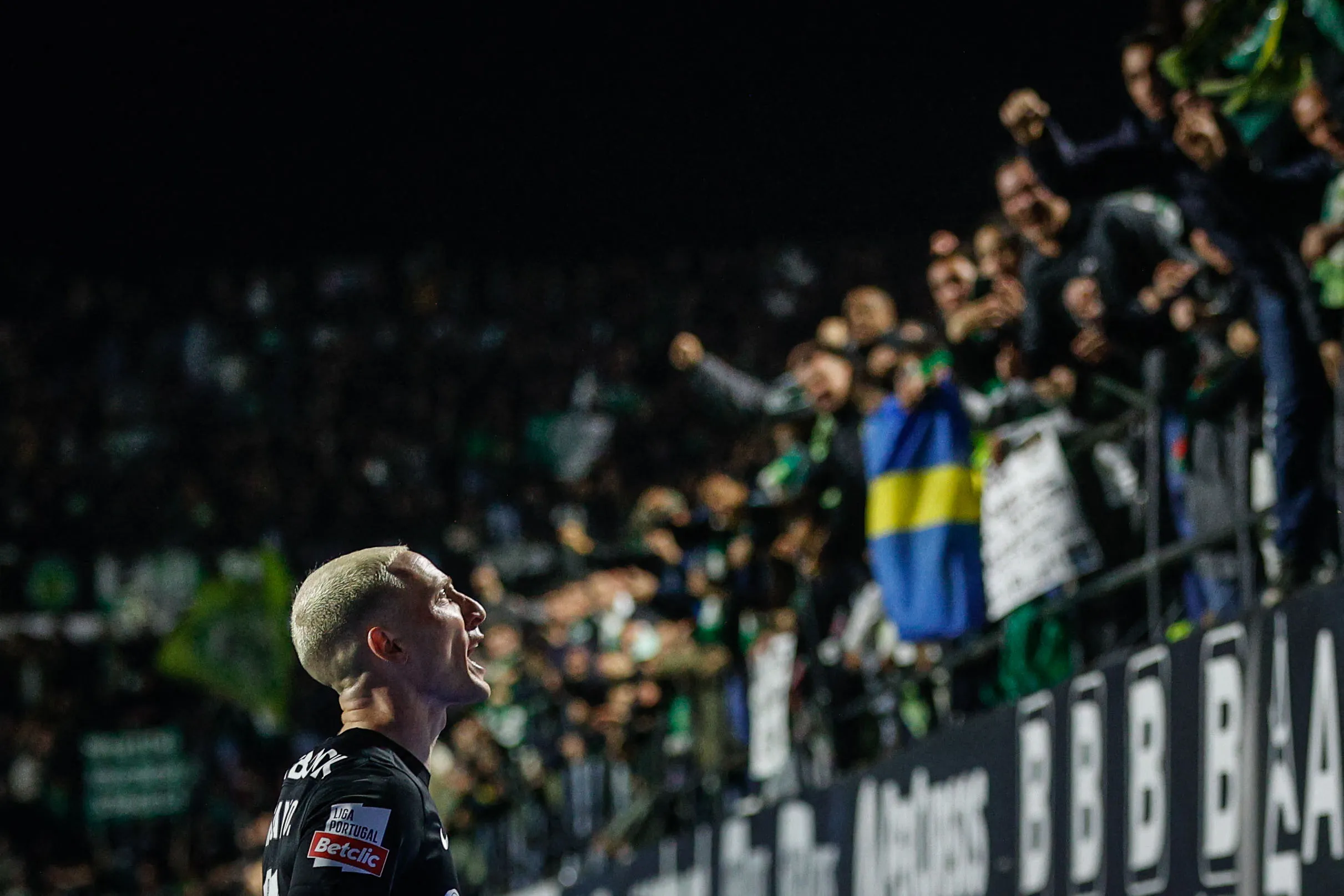 Sporting Lisbon's Portuguese midfielder #11 Nuno Santos celebrates scoring his team's second goal during the Portuguese League football match between Estrela da Amadora and Sporting CP at Jose Gomes stadium in Amadora, outskirts of Lisbon, on March 29, 2024. (Photo by Andre Dias Nobre/AFP Photo)