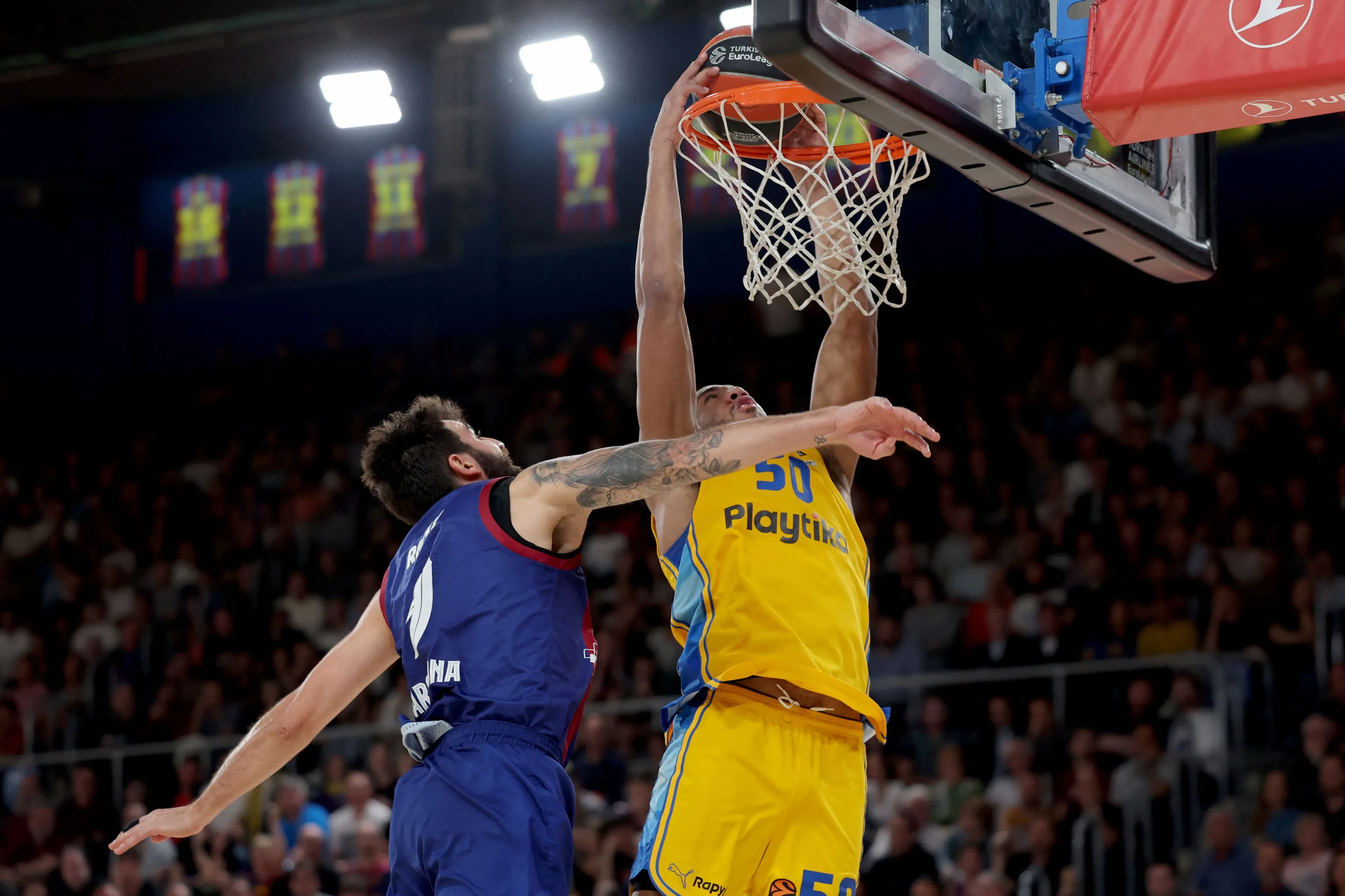 Maccabi's US forward #50 Bonzie Colson dunks against Barcelona's Spanish guard #09 Ricky Rubio during the Euroleague basketball match between FC Barcelona and Maccabi Tel-Aviv BC at the Palau Blaugrana arena in Barcelona on April 4, 2024. (Photo by Lluis Gene/AFP Photo)