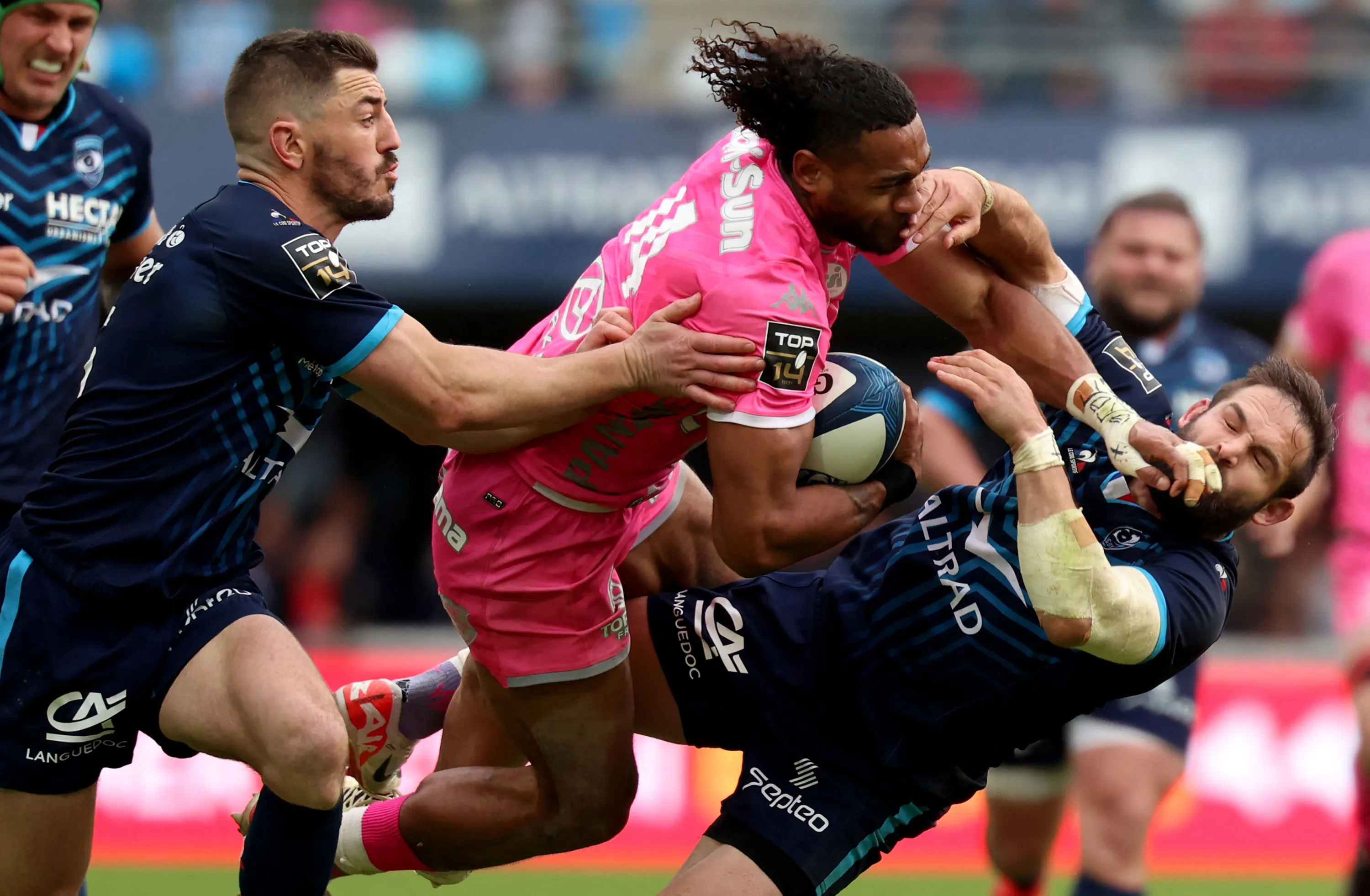 Stade Francais' Fijian wing Peniasi Dakuwaqa (C) fights for the ball with Montpellier's French full-back Anthony Bouthier (L) and Montpellier's South African scrum-half Cobus Reinach (R) during a French Top 14 rugby union match between Montpellier Herault Rugby (MHR) and Stade Francais Paris at the GGL stadium in Montpellier, south-western France, on March 30, 2024. (Photo by Pascal Guyot/AFP Photo)