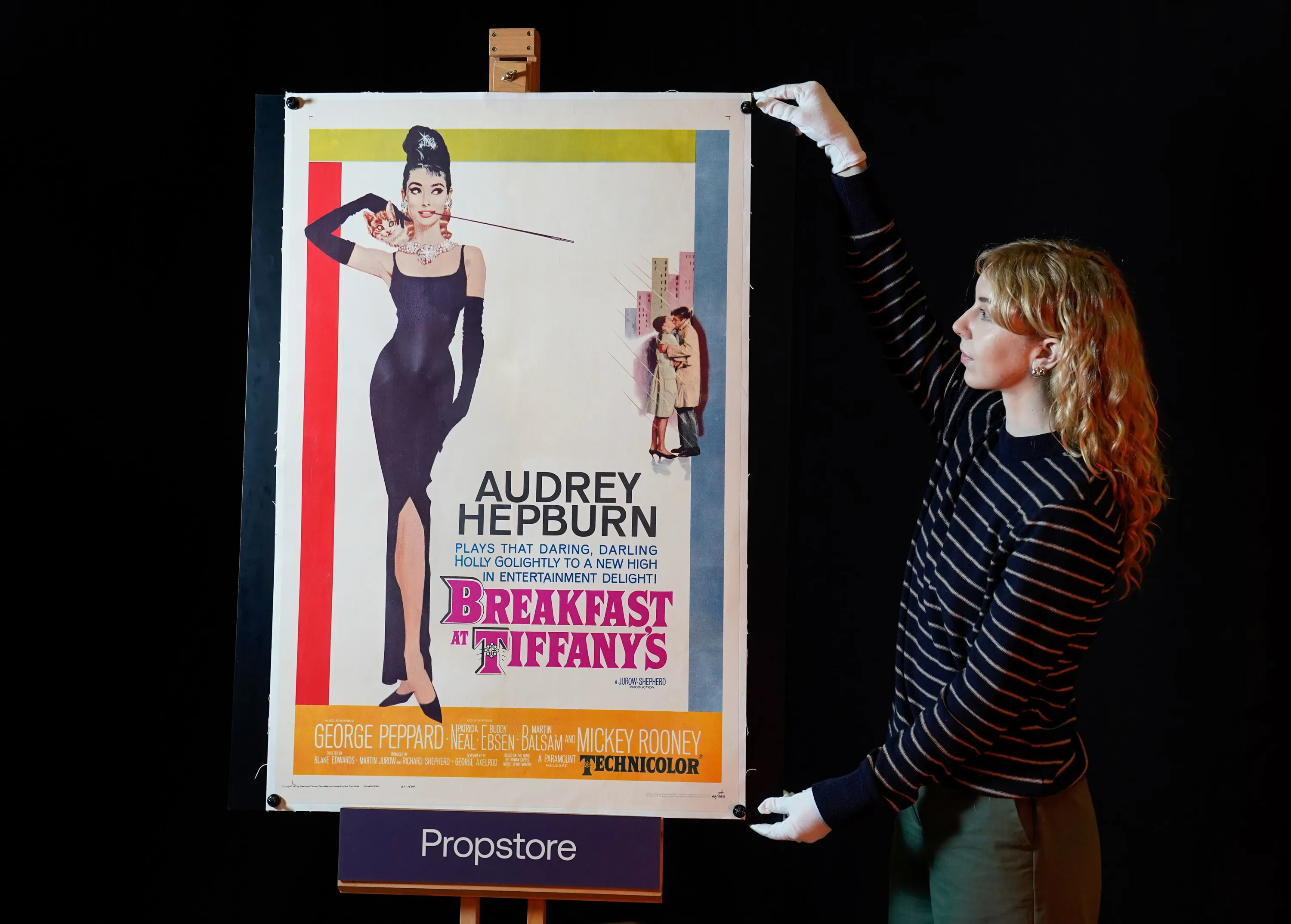 A Propstore employee adjusts a US one-sheet for the 1961 film “Breakfast at Tiffany's” (Estimate £5000 - £10,000) during a preview for the showbiz memorabilia auction, at the Propstore in Rickmansworth, Hertfordshire on Thursday, January 19, 2023. (Photo by Andrew Matthews/PA Images via Getty Images)