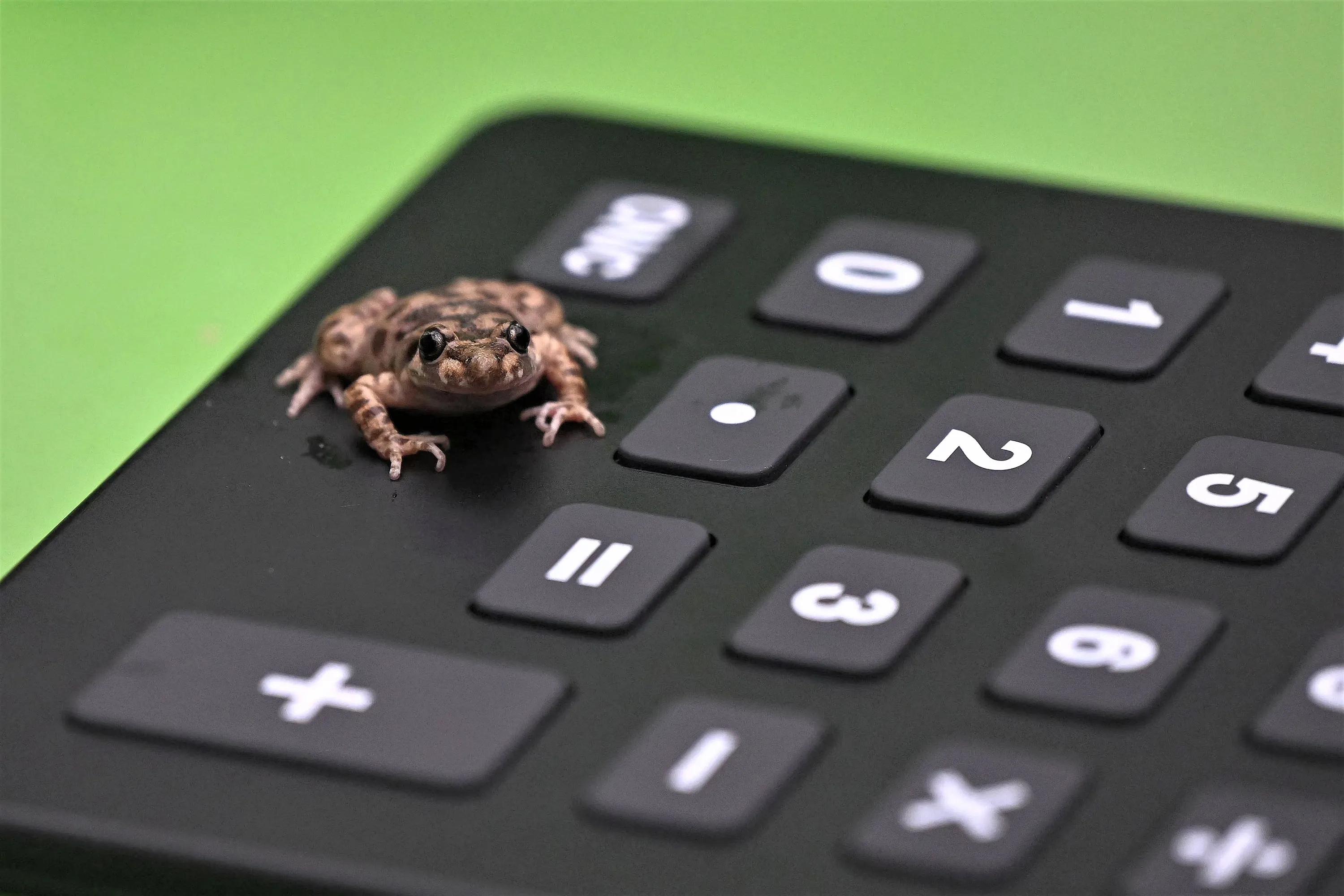 A Majorcan midwife toad sits on a calculator during the annual stocktake at ZSL London Zoo in central London on January 3, 2023. (Photo by Justin Tallis/AFP Photo)