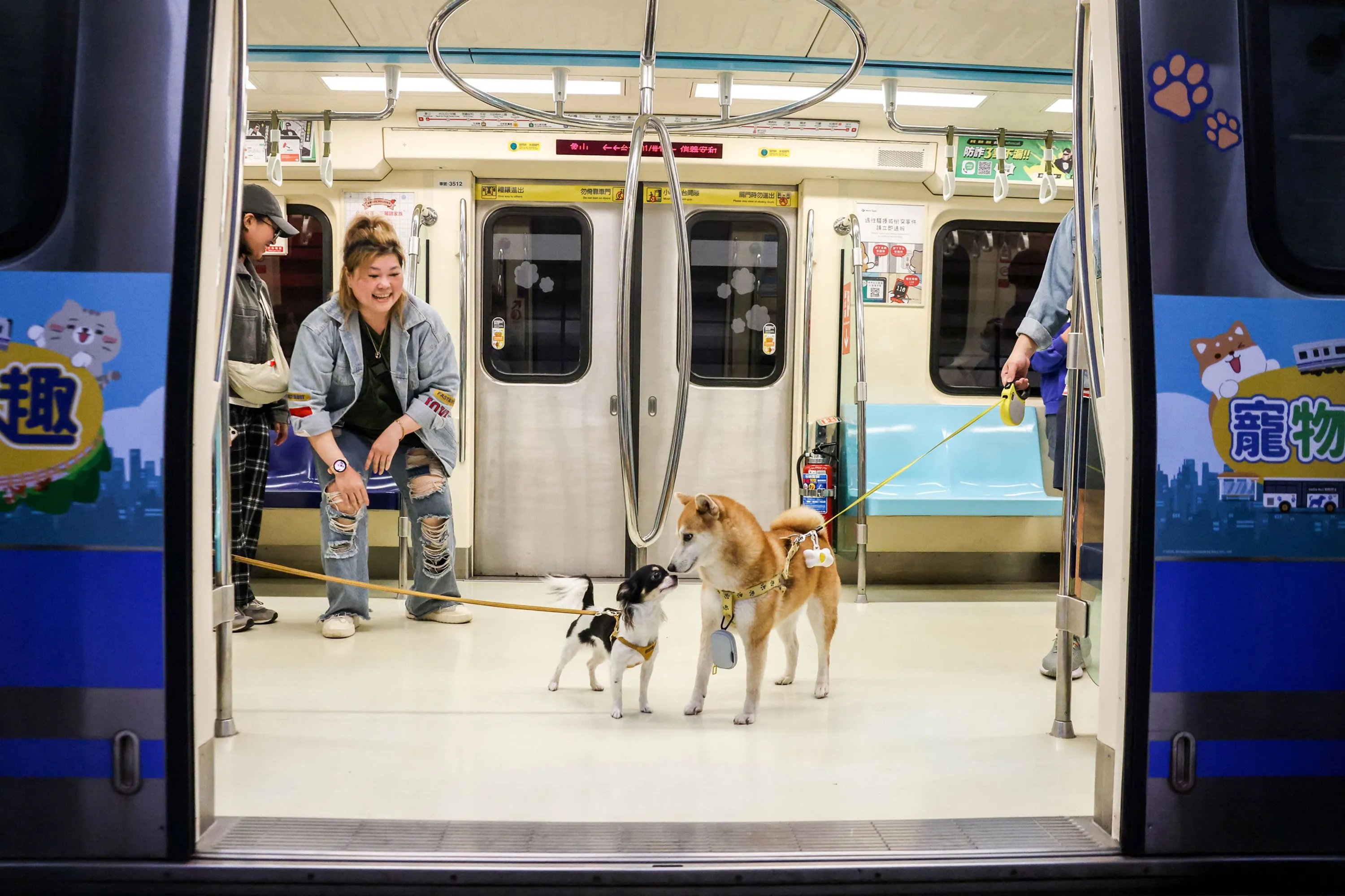 Pet dogs interact with each other while riding a pet-friendly train along the Taipei Mass Rapid Transit (MRT) in Taipei on March 31, 2024. The Taipei Metro on March 31 began operations of two pet-friendly trains along the Red Line, departing Xiangshan station and Tamsui station respectively, with eight trips throughout the day and stopping at all stations along the line as normal. (Photo by I-Hwa Cheng/AFP Photo)