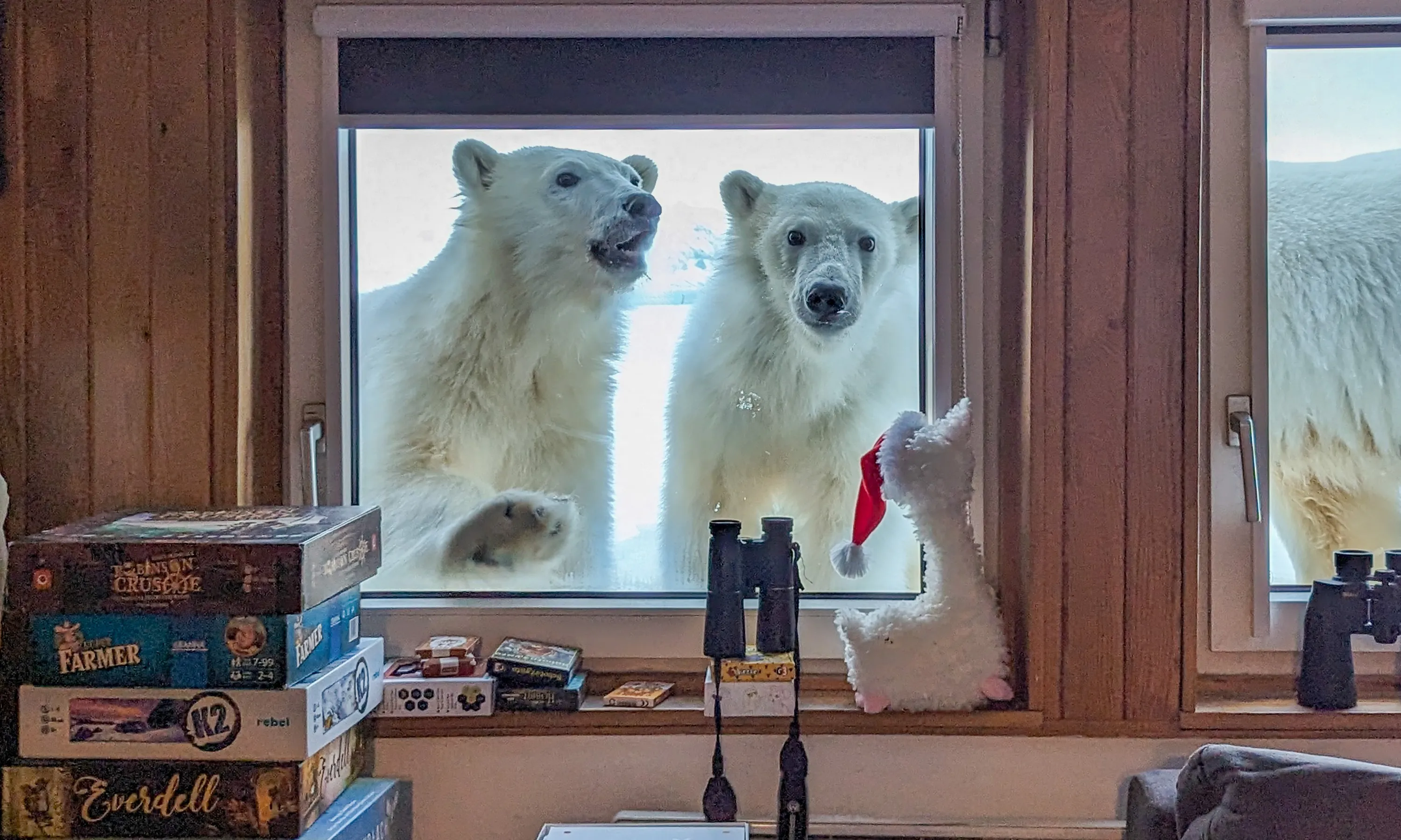 Meteorologist Katarzyna Kudłacz in March 2024 looked up from her breakfast at a Polish research station in Svalbard to see three polar bears – a female and two cubs – with their noses pressed up against the window. The team fired a signal gun to scare off the bears. “It was a wonderful experience, but we must remember that they are wild animals and for them and for us it is better to keep our distance”, she said. (Photo by Katarzyna Kudłacz)