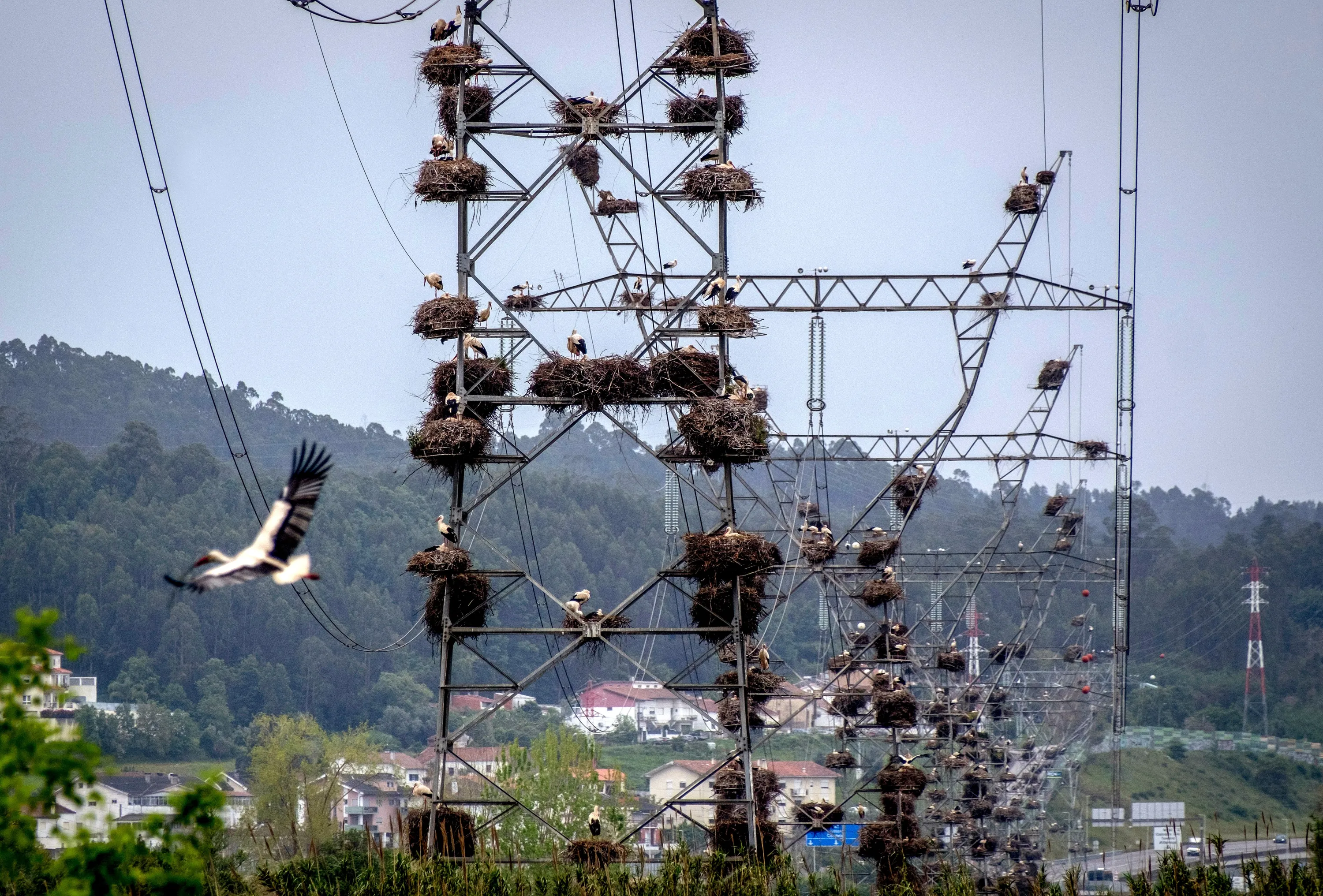 Hundreds of storks rest on their nests built in power poles near the city of Coimbra, Portugal, Saturday, April 6, 2024. (Photo by Michael Probst/AP Photo)