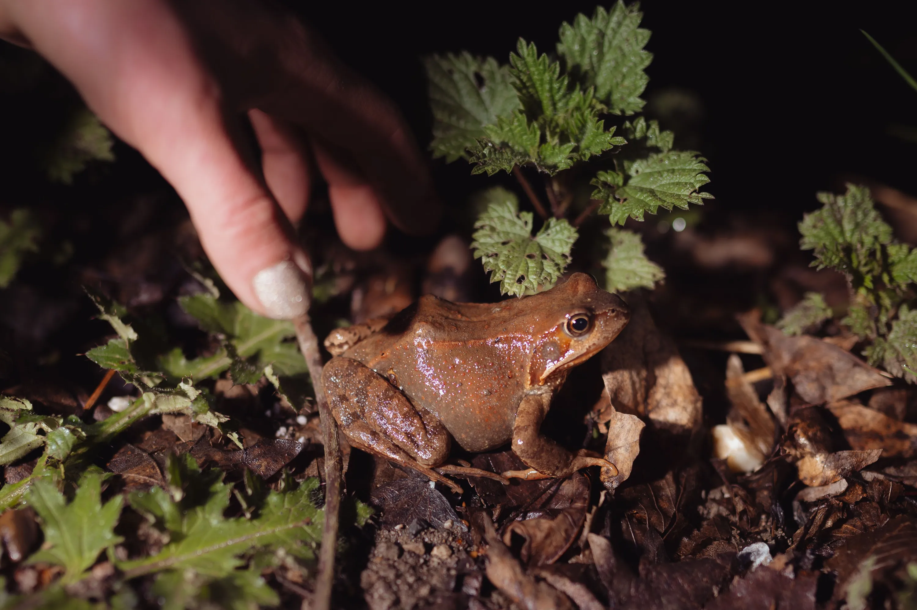 A volunteer from Kosice places frogs into a bucket to help them cross the busy road as they make their way to the nearby waters of the Ruzin water reservoir for breeding as part of their amphibian migration near Margecany in Kosice region, Slovakia on March 28, 2024. (Photo by Robert Nemeti/Anadolu via Getty Images)