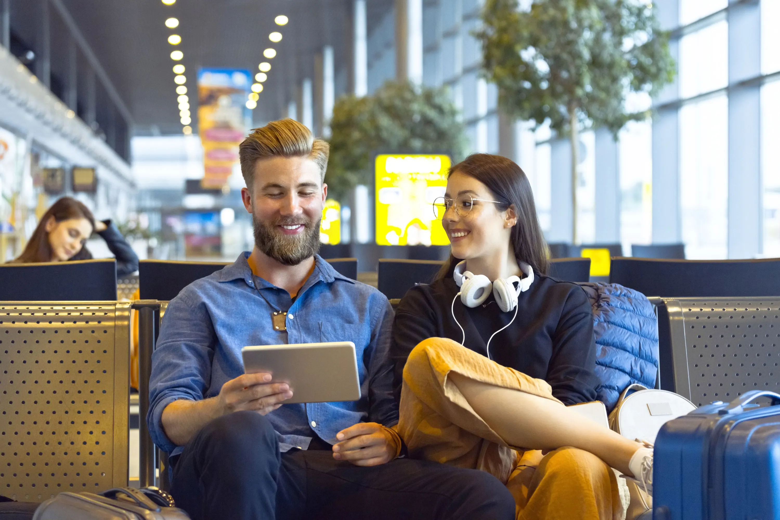 Young woman and man traveling by plane, using a digital tablet in airport waiting area. (Photo by izusek/Getty Images)