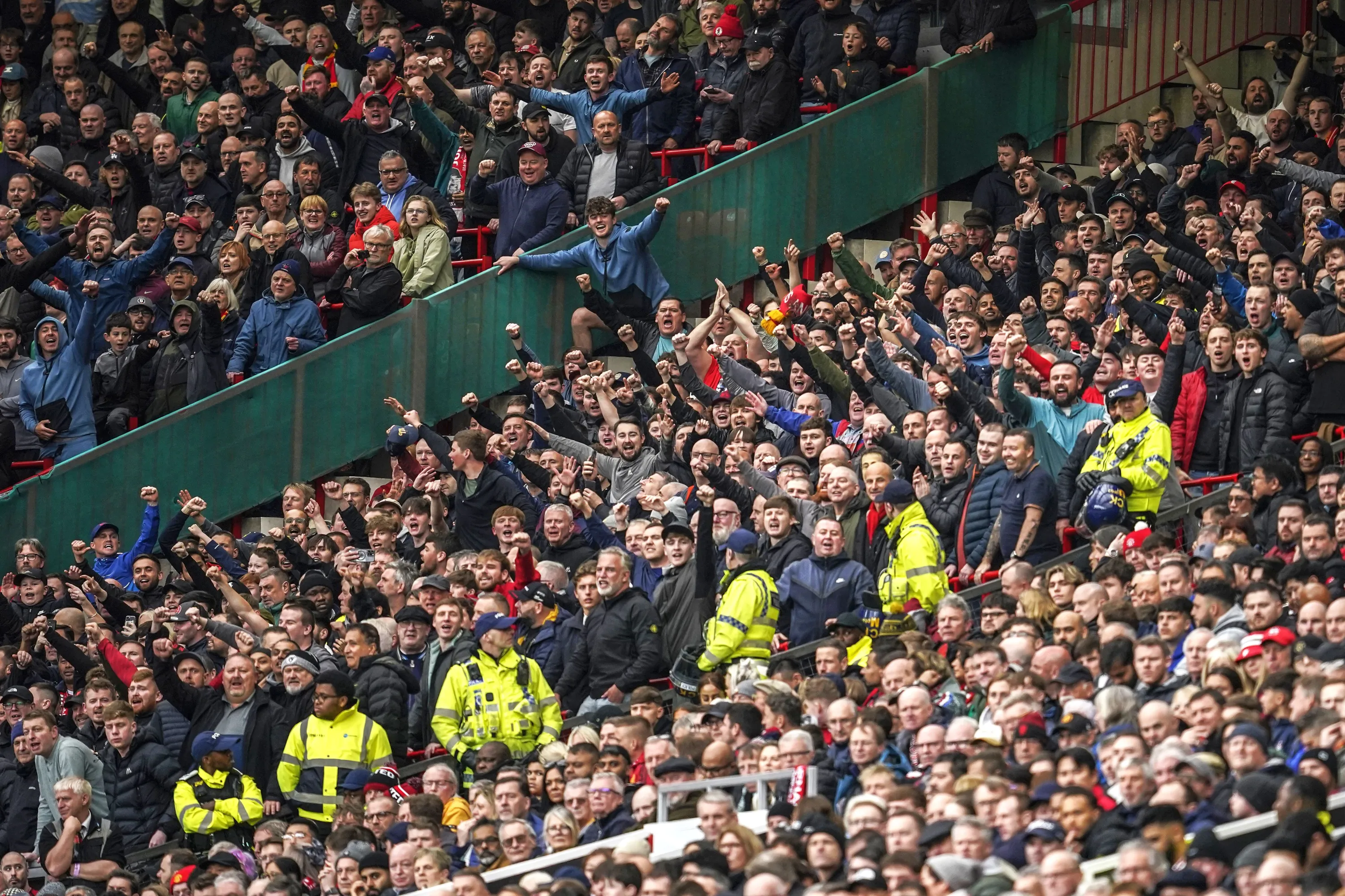 Liverpool's fans, top, celebrate as Luis Diaz scored the opening goal during the English Premier League soccer match between Manchester United and Liverpool at the Old Trafford stadium in Manchester, England, Sunday, April 7, 2024. (Photo by Dave Thompson/AP Photo)