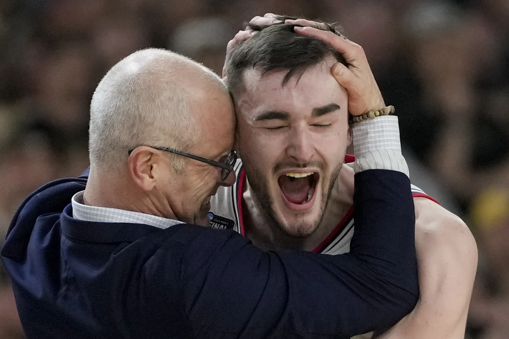 UConn head coach Dan Hurley celebrates with forward Alex Karaban (11) after their win against Purdue in the NCAA college Final Four championship basketball game, Monday, April 8, 2024, in Glendale, Ariz. (Photo by David J. Phillip/AP Photo)