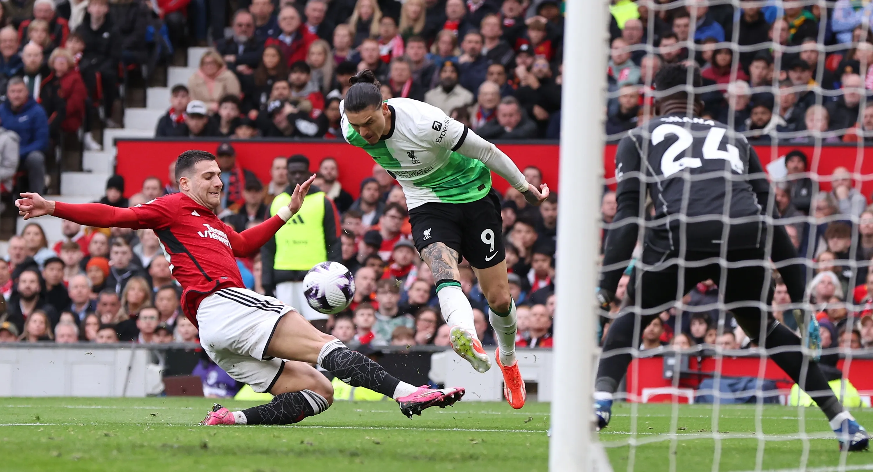 Manchester United's Diogo Dalot (L) and Liverpool's Darwin Nunez (C) in action during the English Premier League soccer match between Manchester United and Liverpool FC in Manchester, Britain, 07 April 2024. (Photo by Adam Vaughan/EPA)