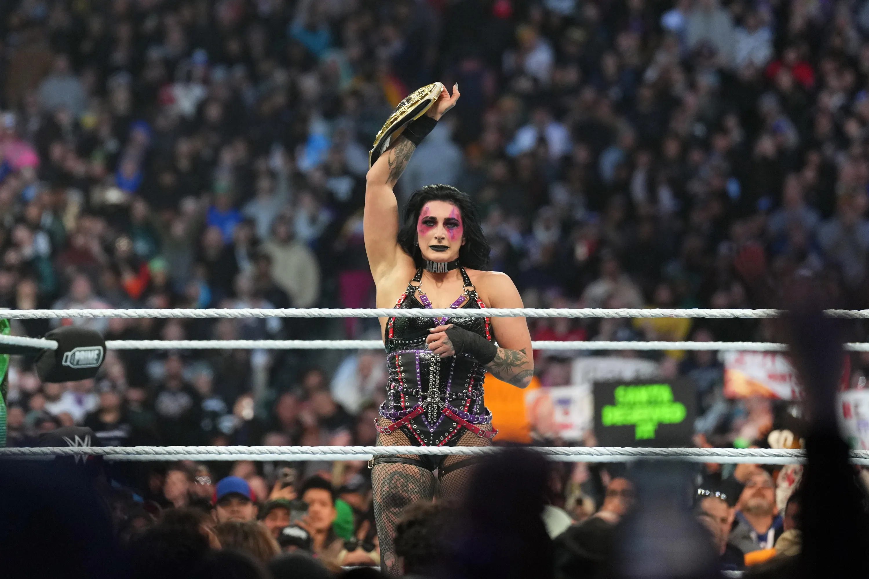 Women’s World Championship match between Rhea Ripley (black attire) and Becky Lynch (red/white attire) during Wrestlemania XL Saturday at Lincoln Financial Field in Philadelphia, PA. on April 6, 2024. (Photo by Joe Camporeale/USA TODAY Sports)