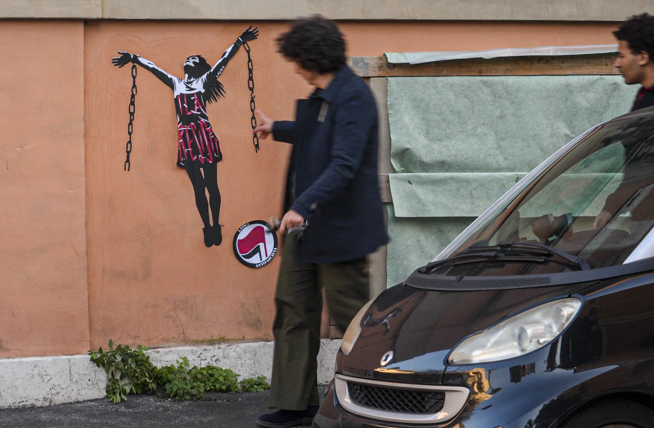 Passersby look at a mural painting depicting Italian antifascist activist Ilaria Salis in the act of breaking her chains near the Hungarian Embassy in Rome, Wednesday, January 31, 2024. Italy has ramped up its protests over the treatment of Salis being held in a Hungarian jail after images of her appearing chained and shackled at a Budapest court hearing this week sparked outrage here. (Photo by Luigi Navarra/AP Photo)