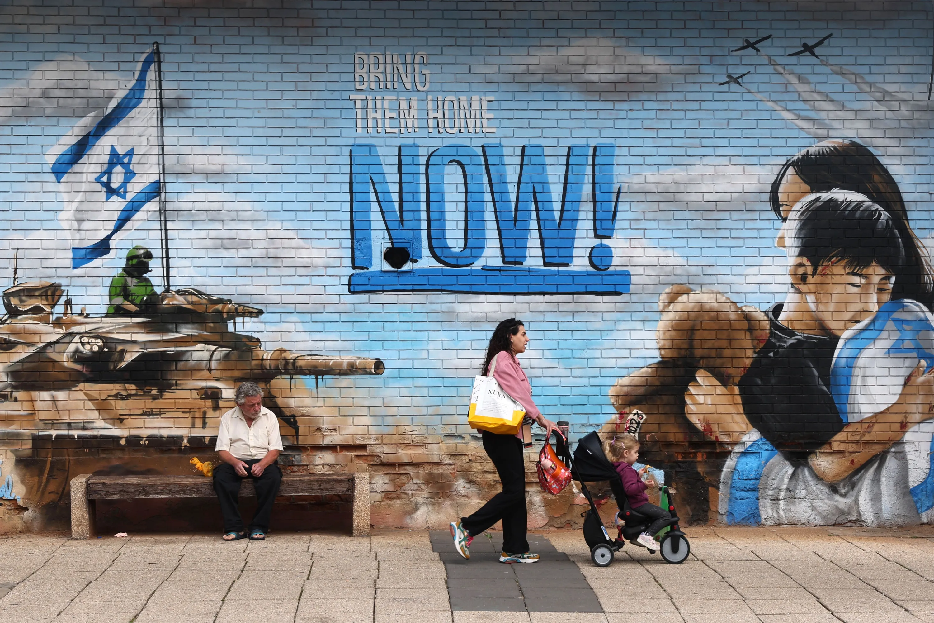 People walk past graffiti on a wall in the Israeli town of Kfar Saba on February 27, 2024, calling for the return of hostages kidnapped during the deadly October 7 attack on Israel by the Palestinian Islamist group Hamas from the Gaza Strip, amid the ongoing conflict in Gaza between Israel and the Palestinian militant group. (Photo by Jack Guez/AFP Photo)