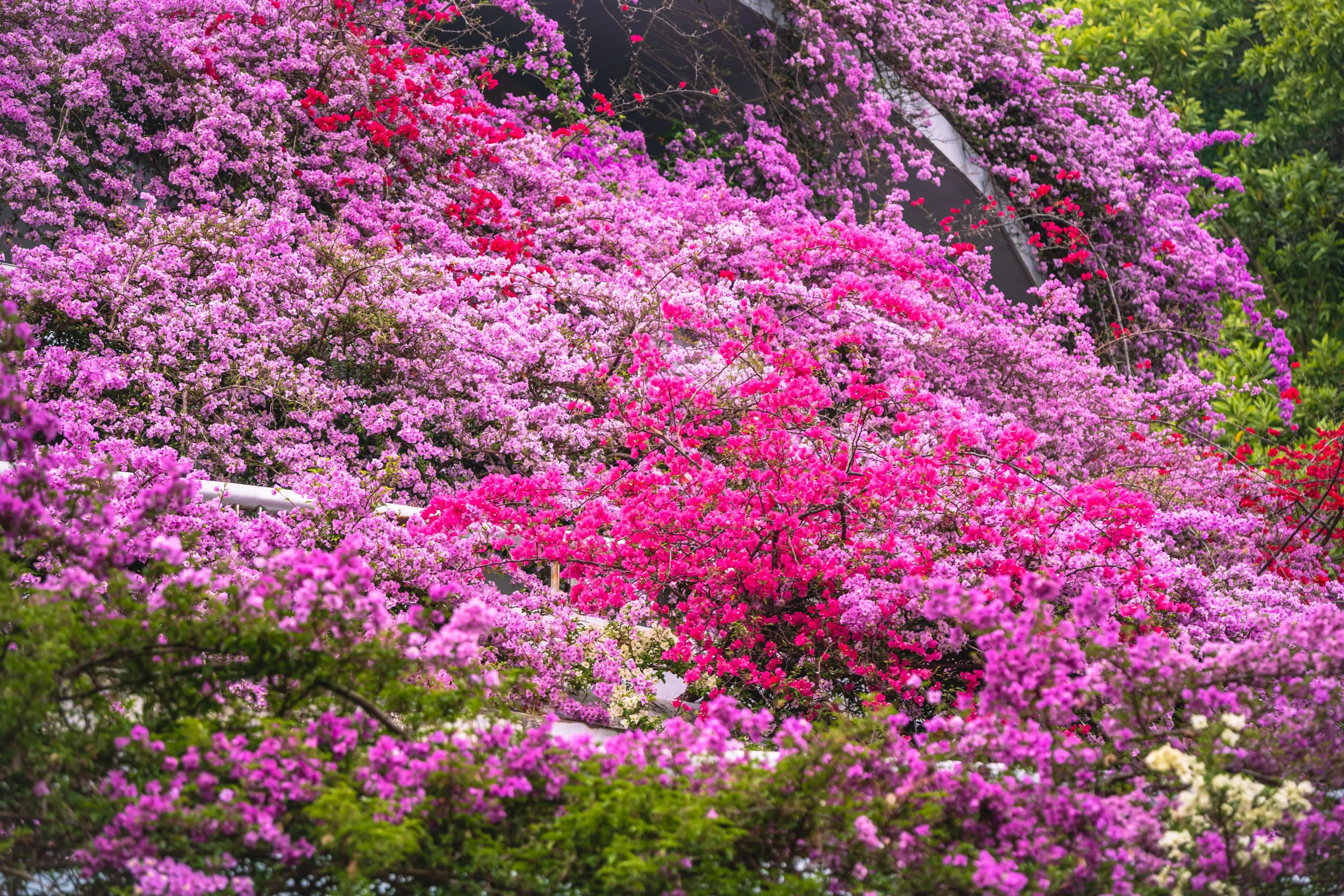 Bougainvillea flowers bloom at a parking lot of the Fairy Lake Botanical Garden on March 31, 2024 in Shenzhen, Guangdong Province of China. (Photo by VCG/VCG via Getty Images)