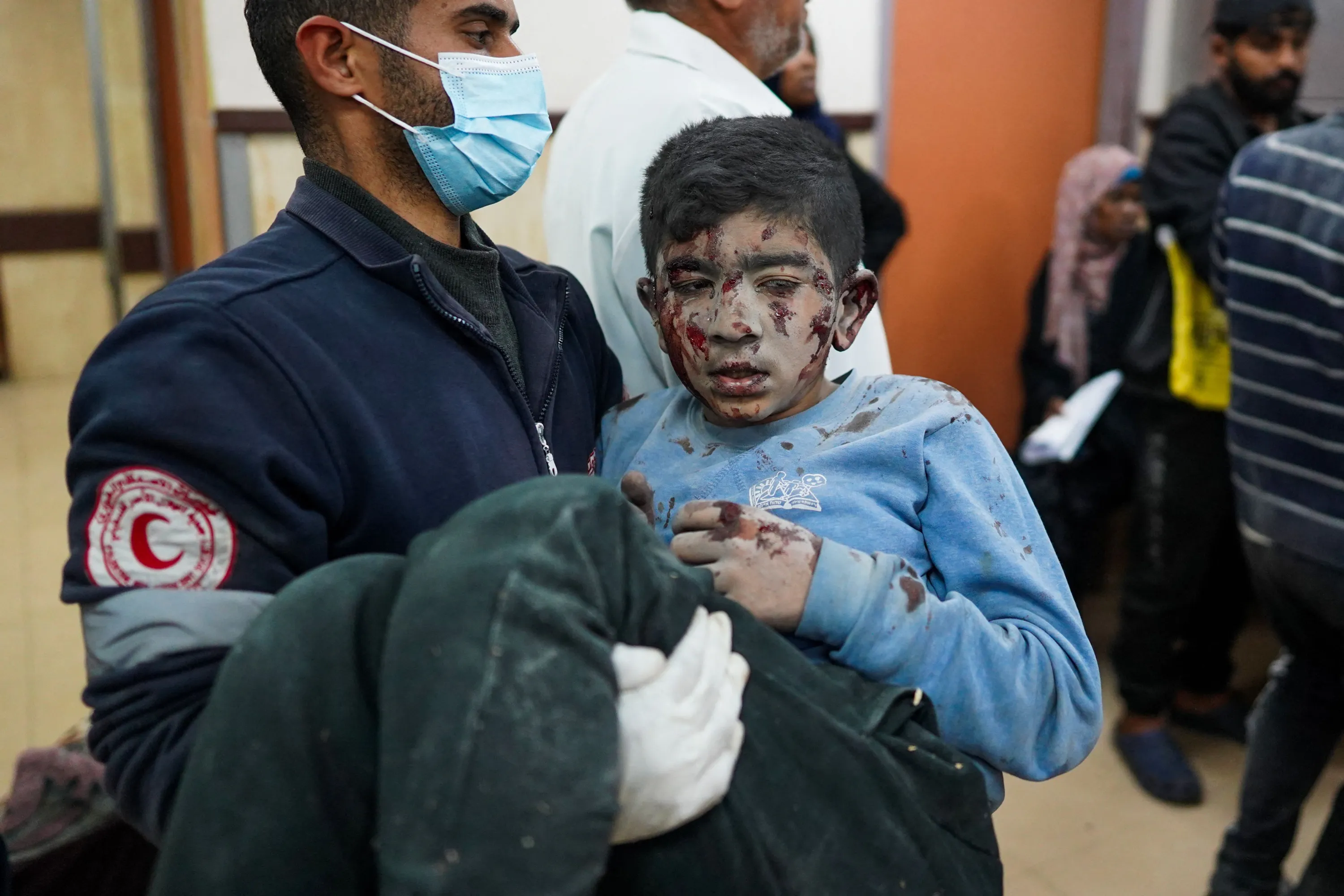 A medic carries a wounded Palestinian boy into the Al-Aqsa Martyrs Hospital in Deir al-Balah on March 19, 2024, following Israeli bombardment in the Nuseirat refugee camp in the central Gaza Strip amid ongoing battles between Israel and the militant group Hamas. (Photo by AFP Photo)