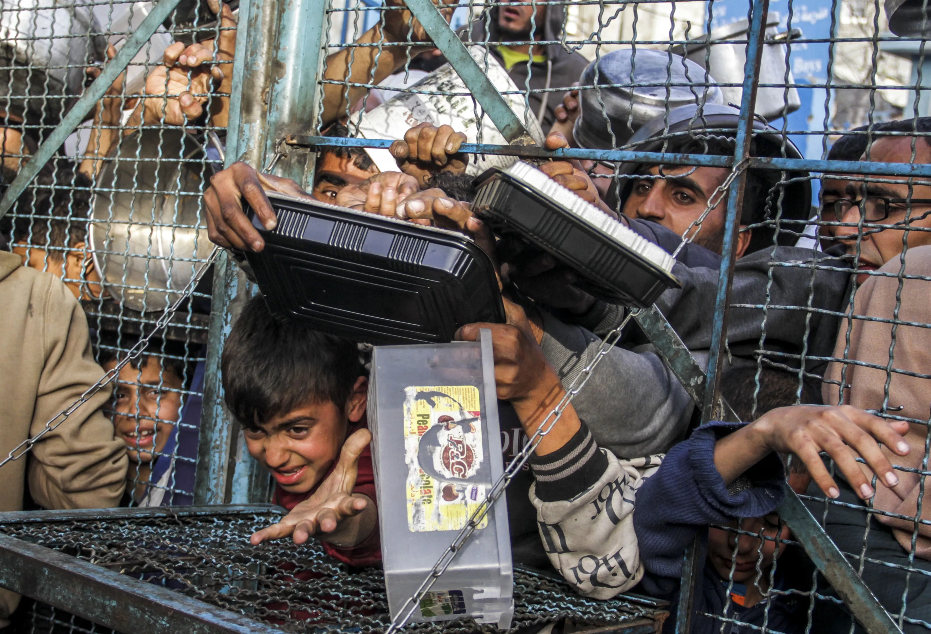 Crowd of starving Palestinians, including children, wait to receive food distributed by charity organizations amid Israel's blockade as the situation dramatically deteriorates in Jabalia refugee camp, Gaza on March 27, 2024. (Photo by Mahmoud Issa/Anadolu via Getty Images)