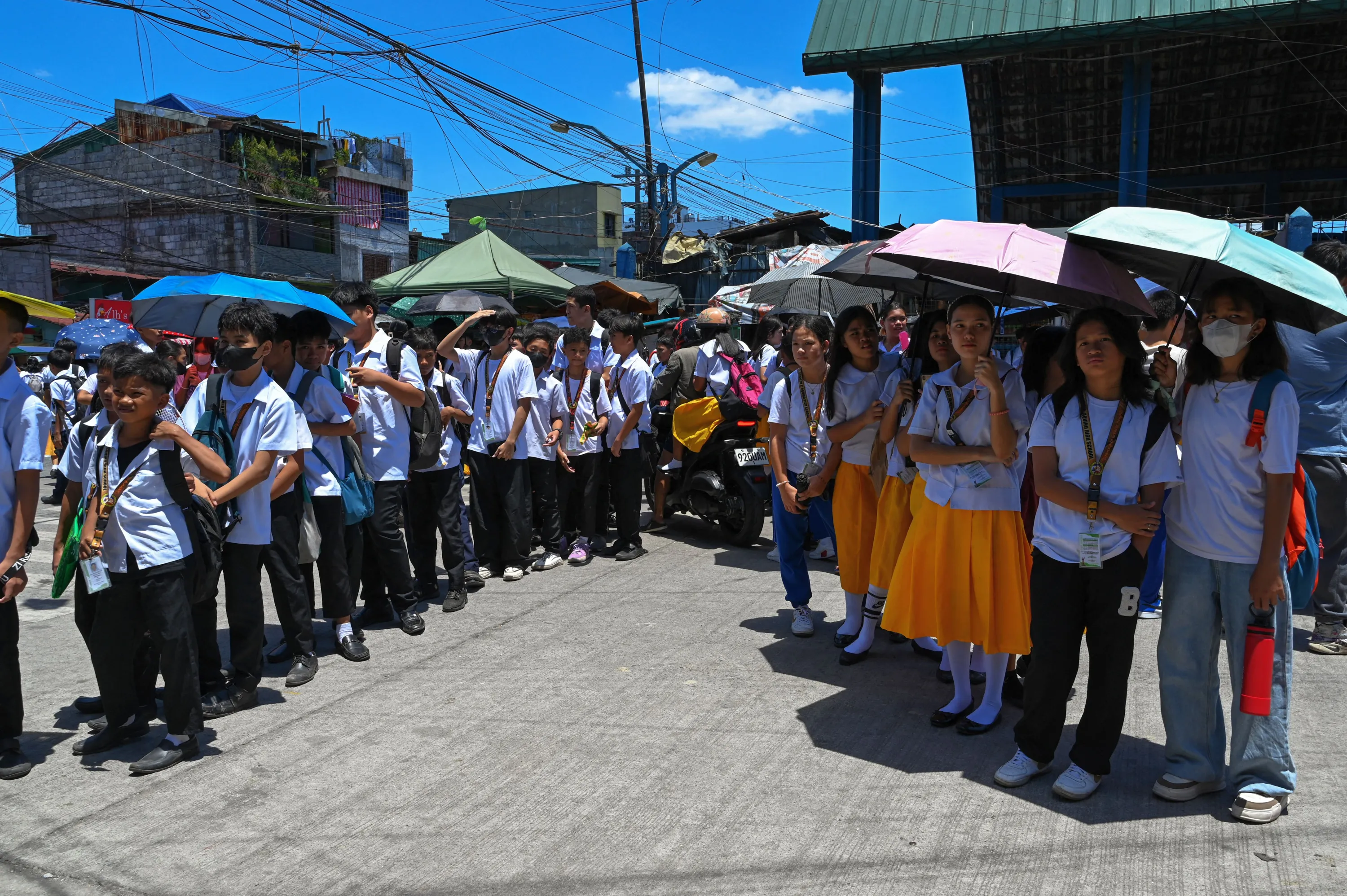 Students use umbrellas to protect themselves from the sun as they line up to wait for their classes outside their school in Manila on April 2, 2024. More than a hundred schools in the Philippine capital shut their classrooms on April 2, as the tropical heat hit “danger” levels, education officials said. (Photo by Jam Sta Rosa/AFP Photo)