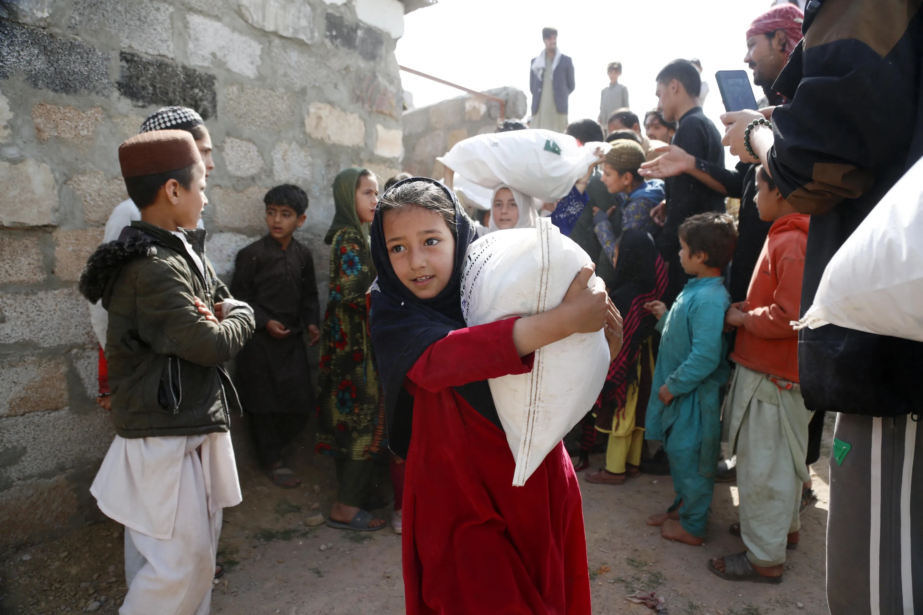Children receive bags of gifts given by Chinese and Pakistani volunteers at a slum in Islamabad, Pakistan, on March 17, 2024. A group of a dozen Chinese and Pakistani volunteers associated with China-Pakistan Youth Exchange Community, and Beijing One Heart Sphere Charity Foundation visited two schools and delivered about 200 donation bags of gifts to children and women. (Photo by Xinhua News Agency/Rex Features/Shutterstock)