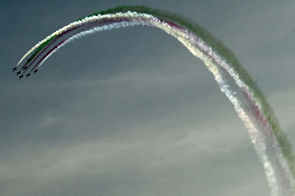 Pakistan's jets perform aerobatic maneuvers during a rehearsal ahead of the Pakistan's Day parade, in Islamabad on March 17, 2024. (Photo by Aamir Qureshi/AFP Photo)