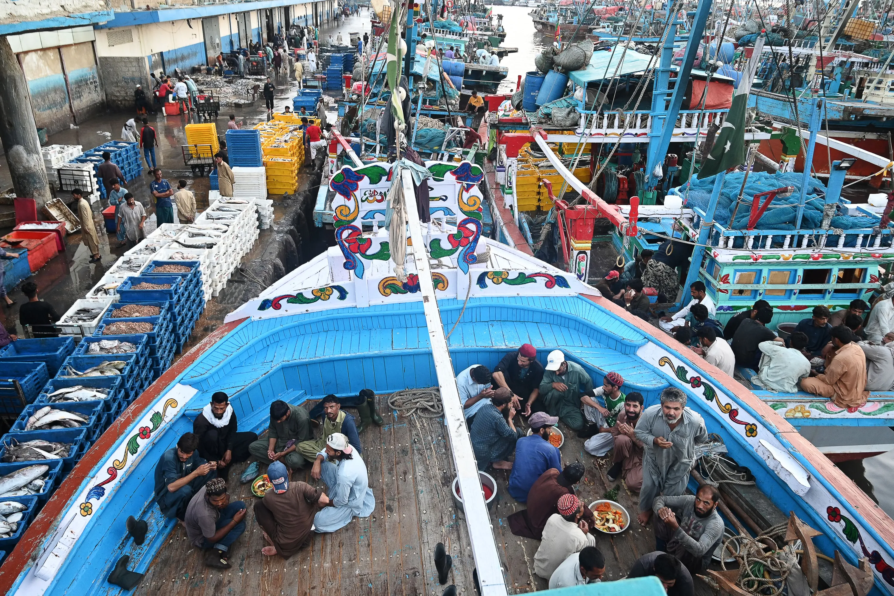 Fishermen break their fast on the decks of fishing boats at a harbor during the Islamic holy month of Ramadan in Karachi on March 20, 2024. (Photo by Rizwan Tabassum/AFP Photo)