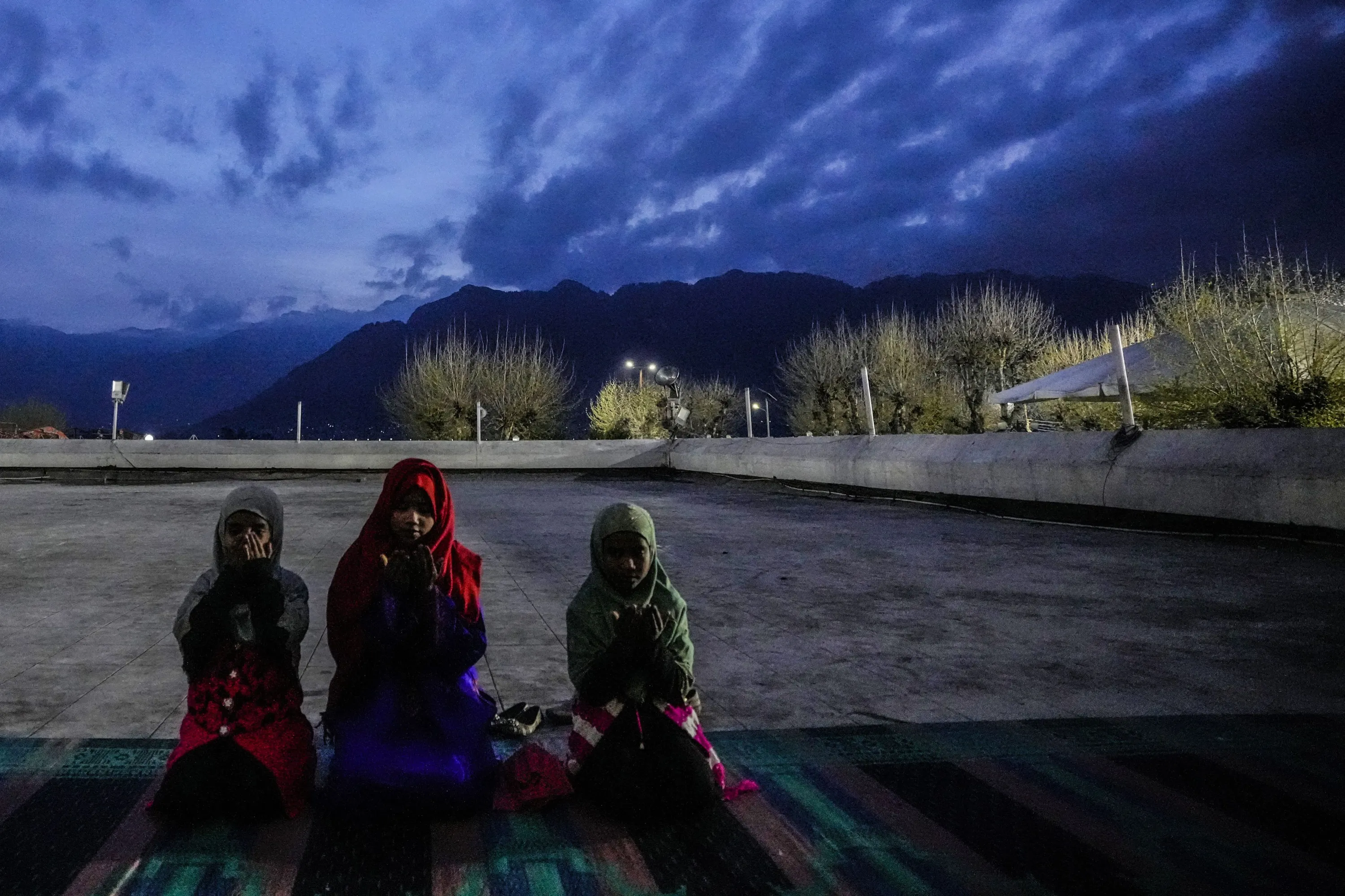 Muslim children offer prayers early morning to observe the martyr day of Hazrat Ali, the fourth caliph of Islam, at Hazratbal shrine in Srinagar, Indian controlled Kashmir, Monday, April 1, 2024. Muslims across the world are observing the holy fasting month of Ramadan, when devout refrain from eating, drinking and smoking from dawn to dusk. (Photo by Mukhtar Khan/AP Photo)