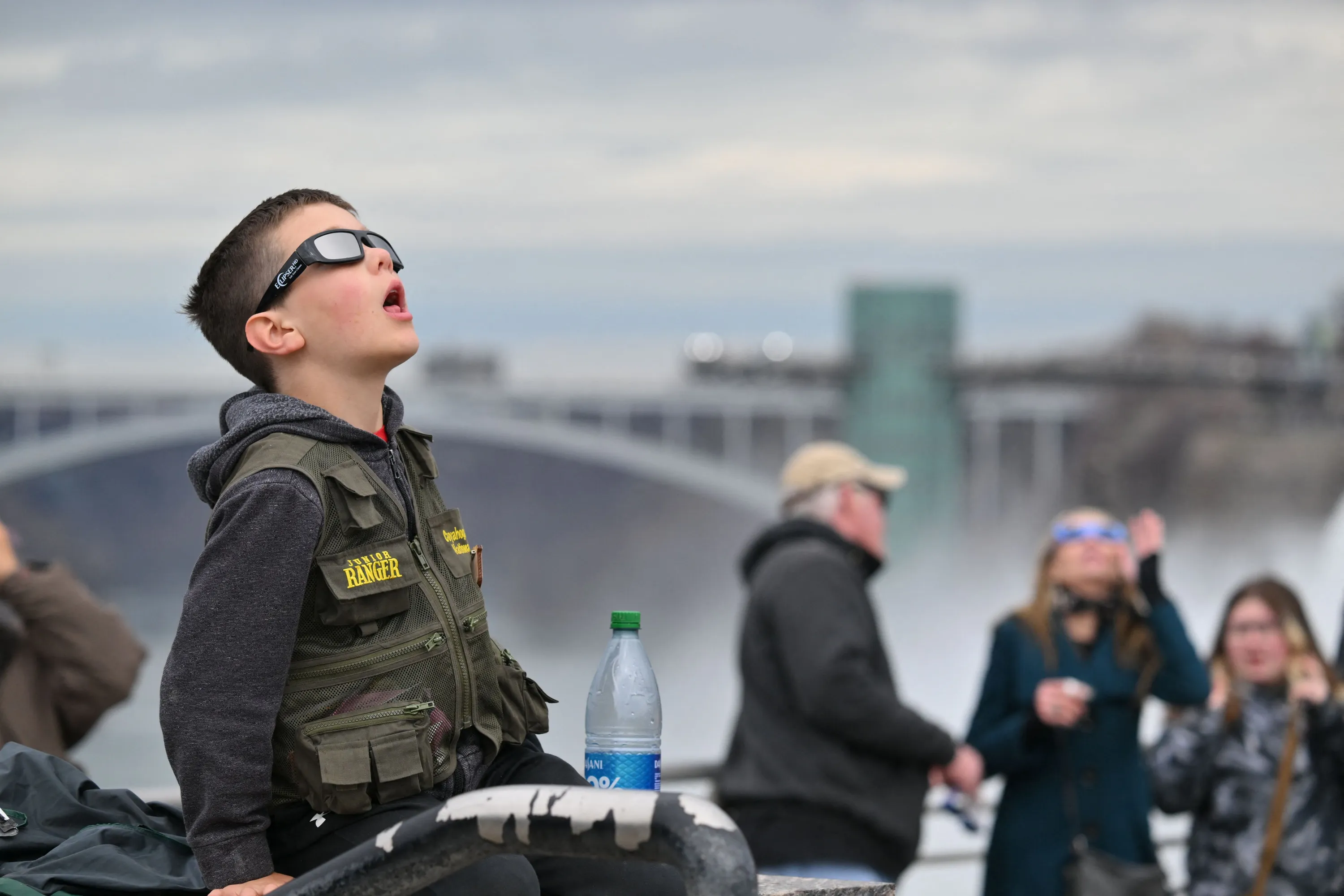 People look up at the sun during a total solar eclipse across North America, at Niagara Falls State Park in Niagara Falls, New York, on April 8, 2024. This year's path of totality is 115 miles (185 kilometers) wide and home to nearly 32 million Americans, with an additional 150 million living less than 200 miles from the strip. The next total solar eclipse that can be seen from a large part of North America won't come around until 2044. (Photo by Angela Weiss/AFP Photo)