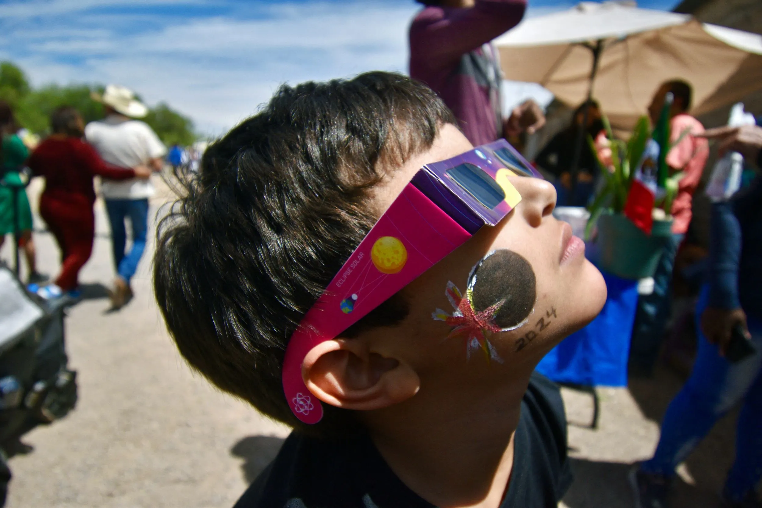 A kid wears special sunglasses to observe the total solar eclipse in Nazas, Durango state, Mexico on April 8, 2024. This year's path of totality is 115 miles (185 kilometers) wide and home to nearly 32 million Americans, with an additional 150 million living less than 200 miles from the strip. The next total solar eclipse that can be seen from a large part of North America won't come around until 2044. (Photo by Haaron Alvarez/AFP Photo)