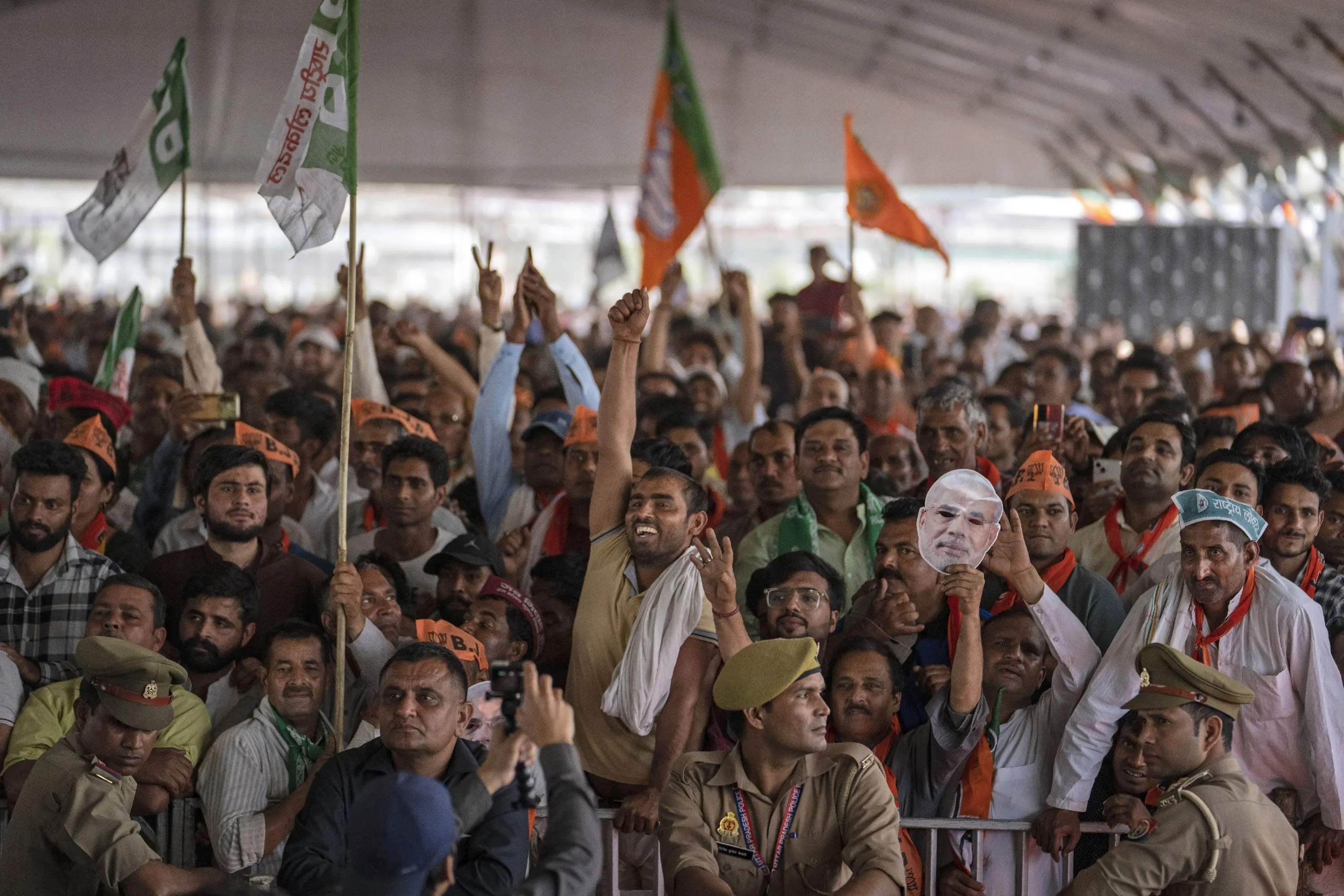 Supporters of India's ruling Bharatiya Janata Party (BJP) react as they listen to Indian Prime Minister Narendra Modi speak at an election rally in Meerut, India, Sunday, March 31, 2024. (Photo by Altaf Qadri/AP Photo)