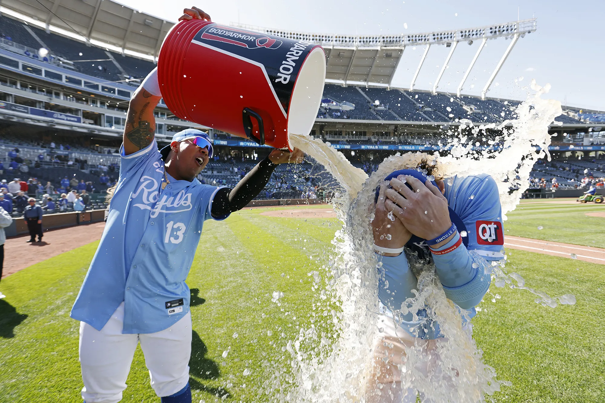 Kansas City Royals' Salvador Perez (13) douses teammate Bobby Witt Jr., right, after a baseball game against the Houston Astros in Kansas City, Mo., Thursday, April 11, 2024. (Photo by Colin E. Braley/AP Photo)