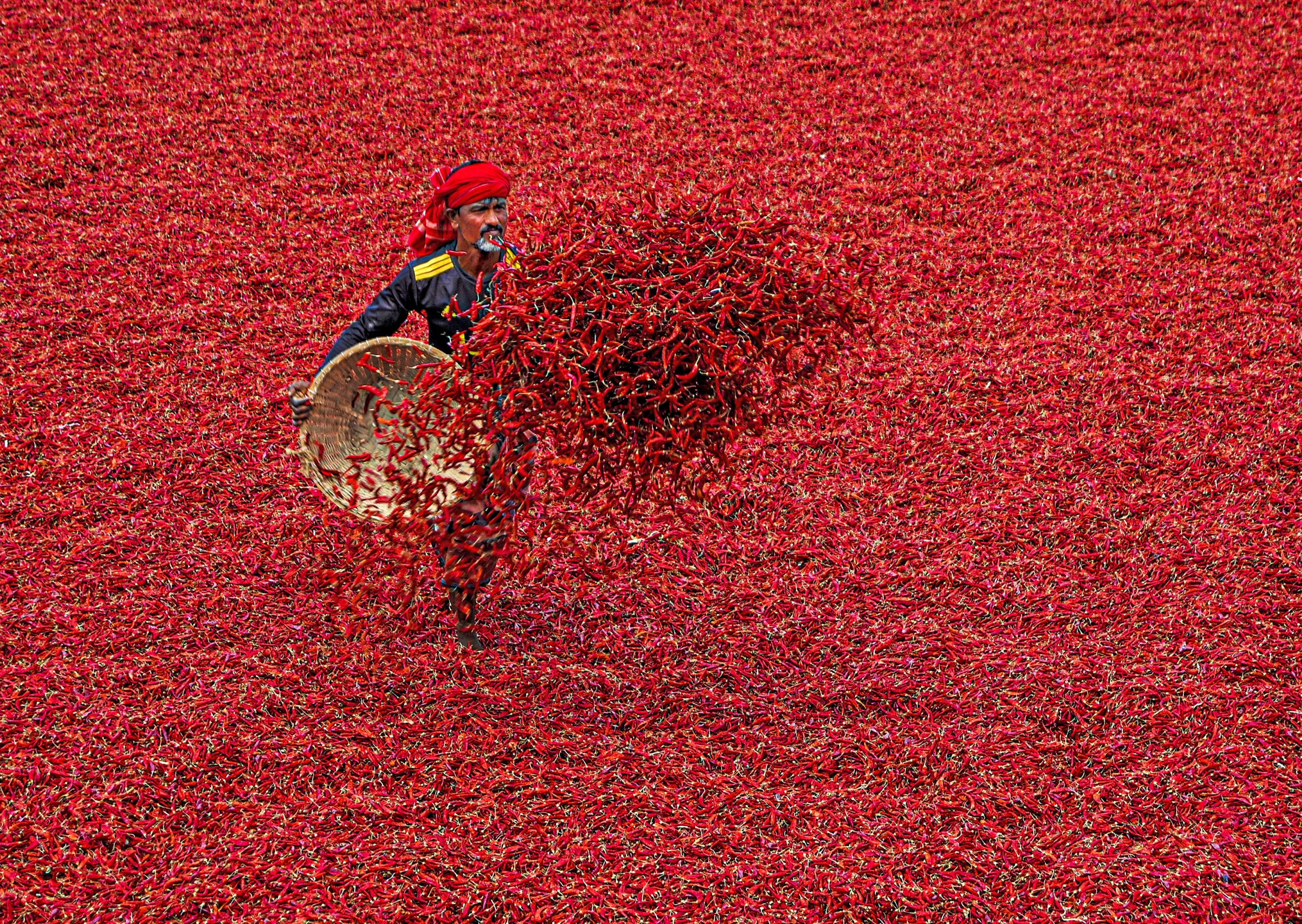 Chillis are dried in the sun in the Chandrapur district of Bangladesh in the second decade of February 2024. If there is a good yield of chillis, they are dried in the fields as well as on the roads or backyards nearby. You can get a yield of up to 2 tonnes per hectare. A mound of dry chilli is sold for between, 4,300 and 4,500 taka (€30 – €32.50) in different local markets of the country. (Photo by Istiyak Ahamed Srabon/Solent News)