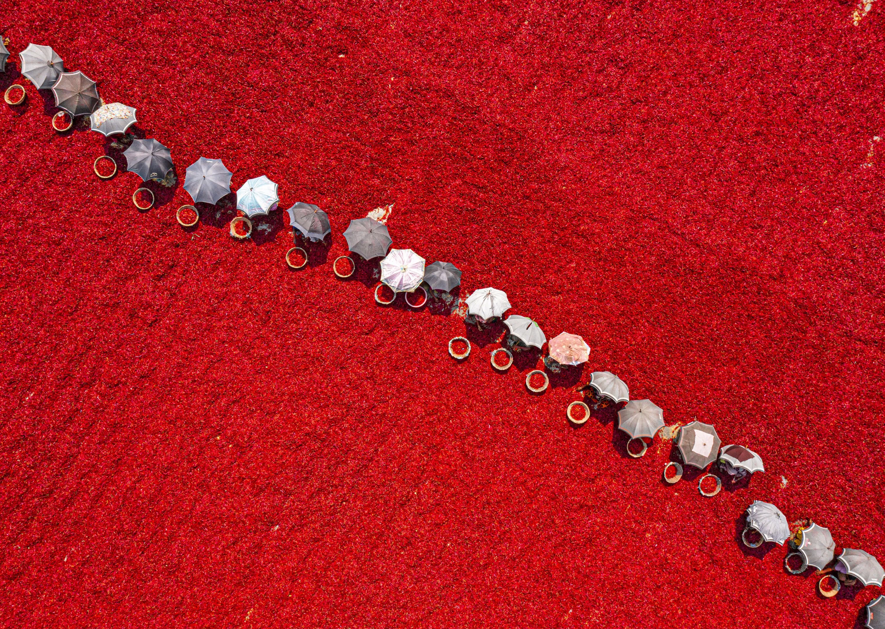 Workers painstakingly lay red chilli peppers out to dry in the sun in Bogura, Bangladesh in the last decade of February 2024, in preparation for being sold at markets around the country. (Photo by Anindita Roy/Solent News)