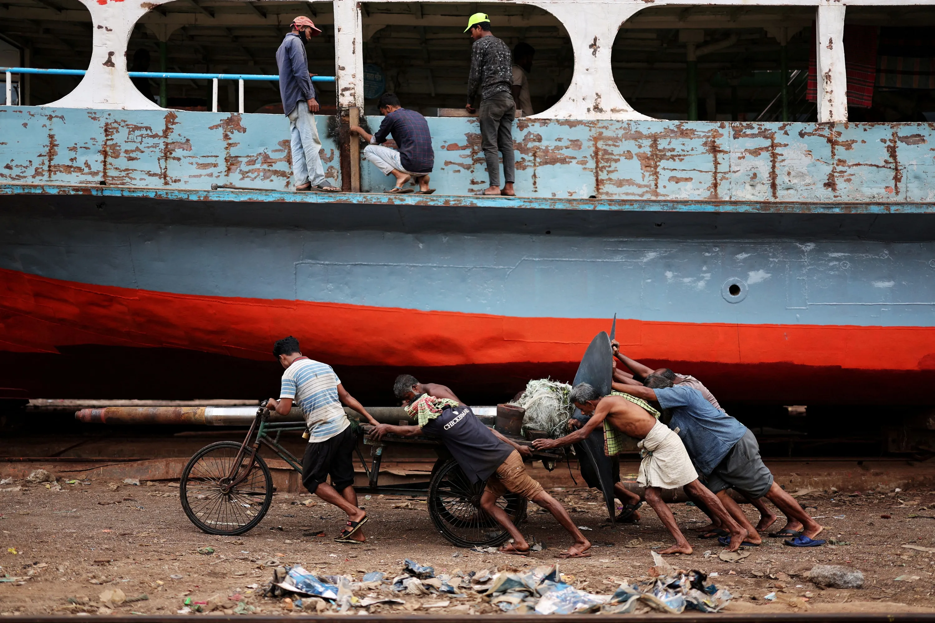 Bangladeshi labourers pull a cart carrying a ferry propeller in a dockyard in Dhaka, Bangladesh on March 27, 2024. (Photo by Mohammad Ponir Hossain/Reuters)
