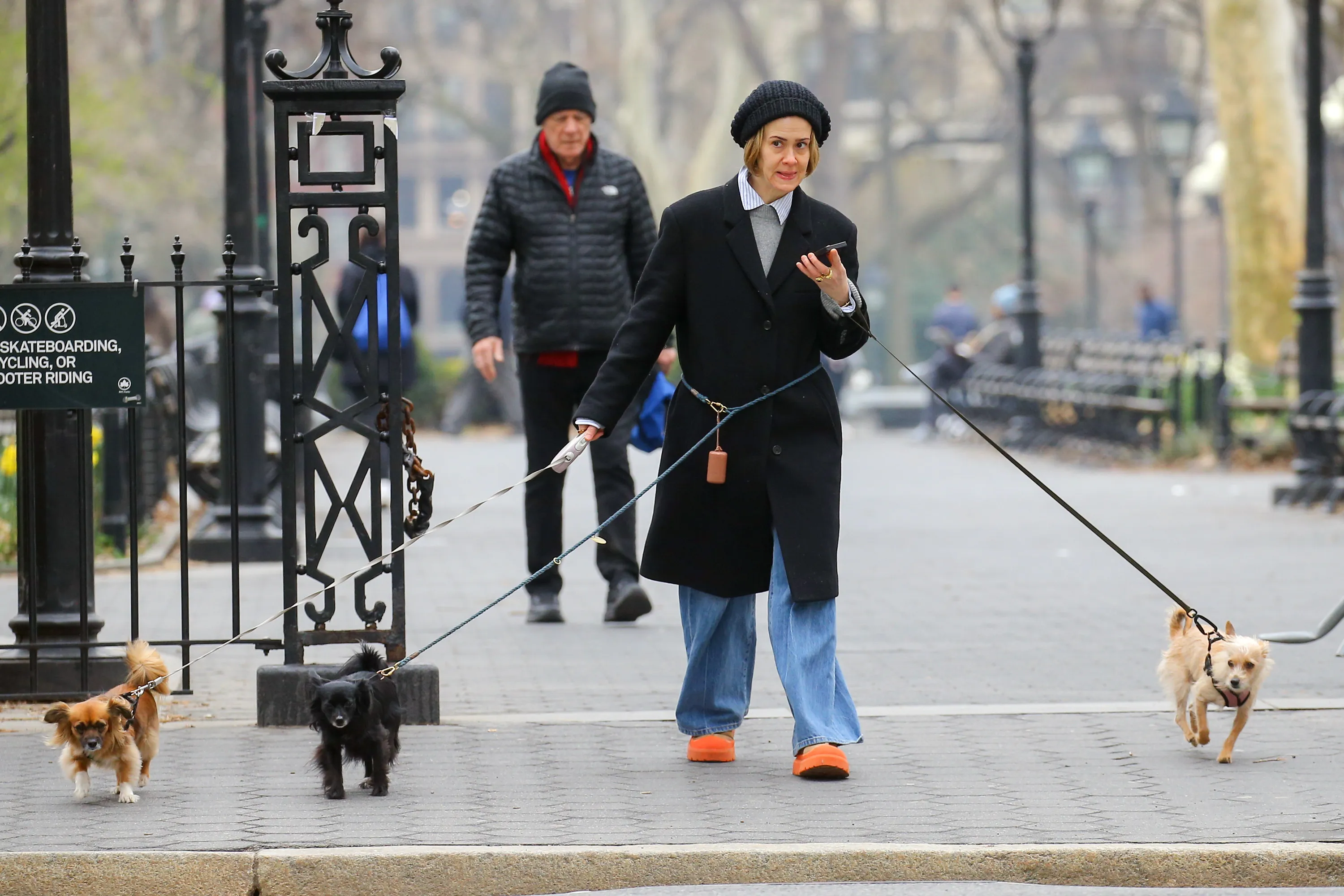 Sarah Paulson spotted taking a stroll with her 3 dogs in New York City on March 26, 2024. The American actress wore a knit beanie, black trench coat, jeans, and UGG Tasman Weather Hybrid Slippers. (Photo by The Image Direct)