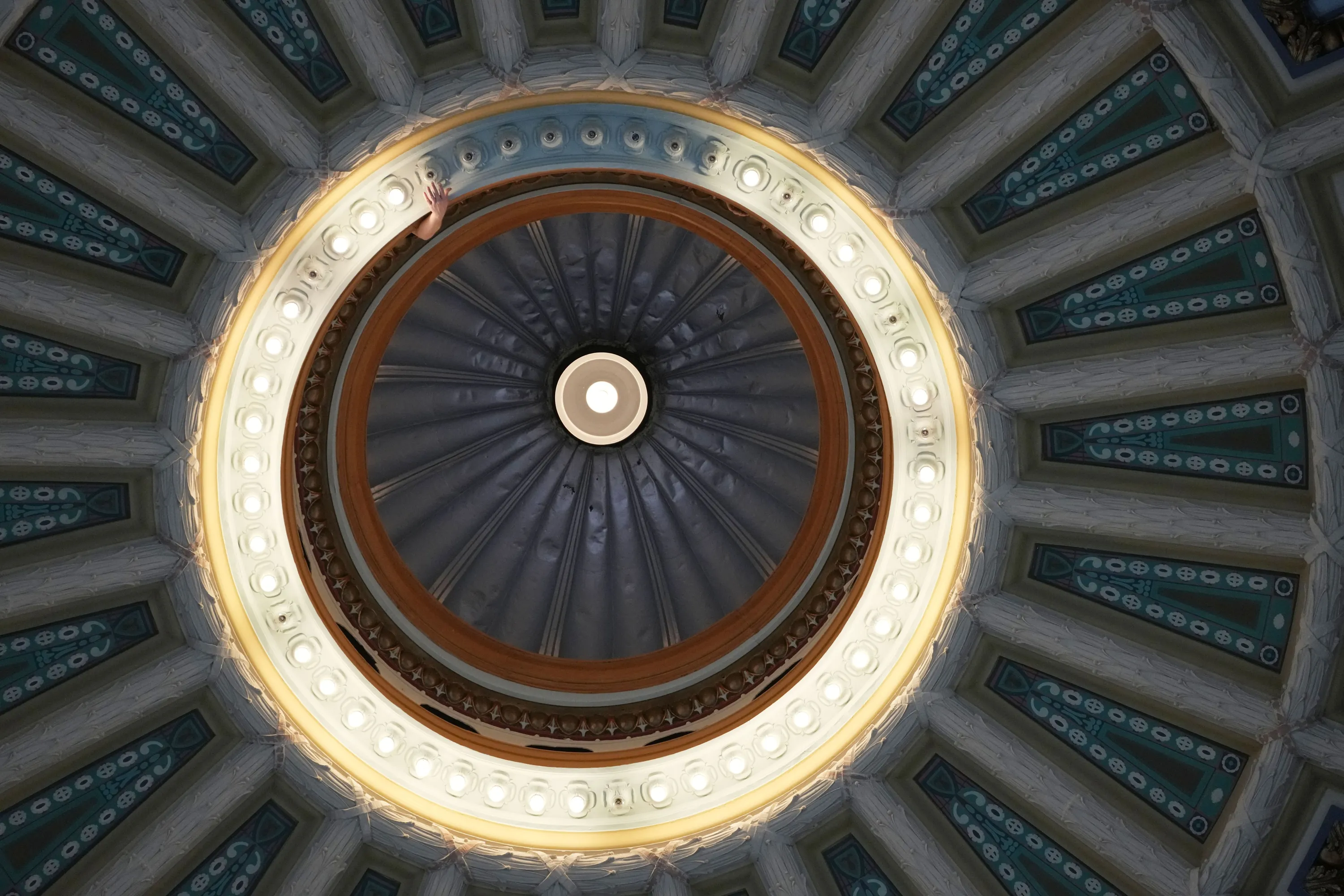 A Mississippi State Capitol facilities worker reaches out to remove a burned out light bulb in the main dome that graces the rotunda of the Capitol in Jackson, Miss. Monday, April 8, 2024. (Photo by Rogelio V. Solis/AP Photo)