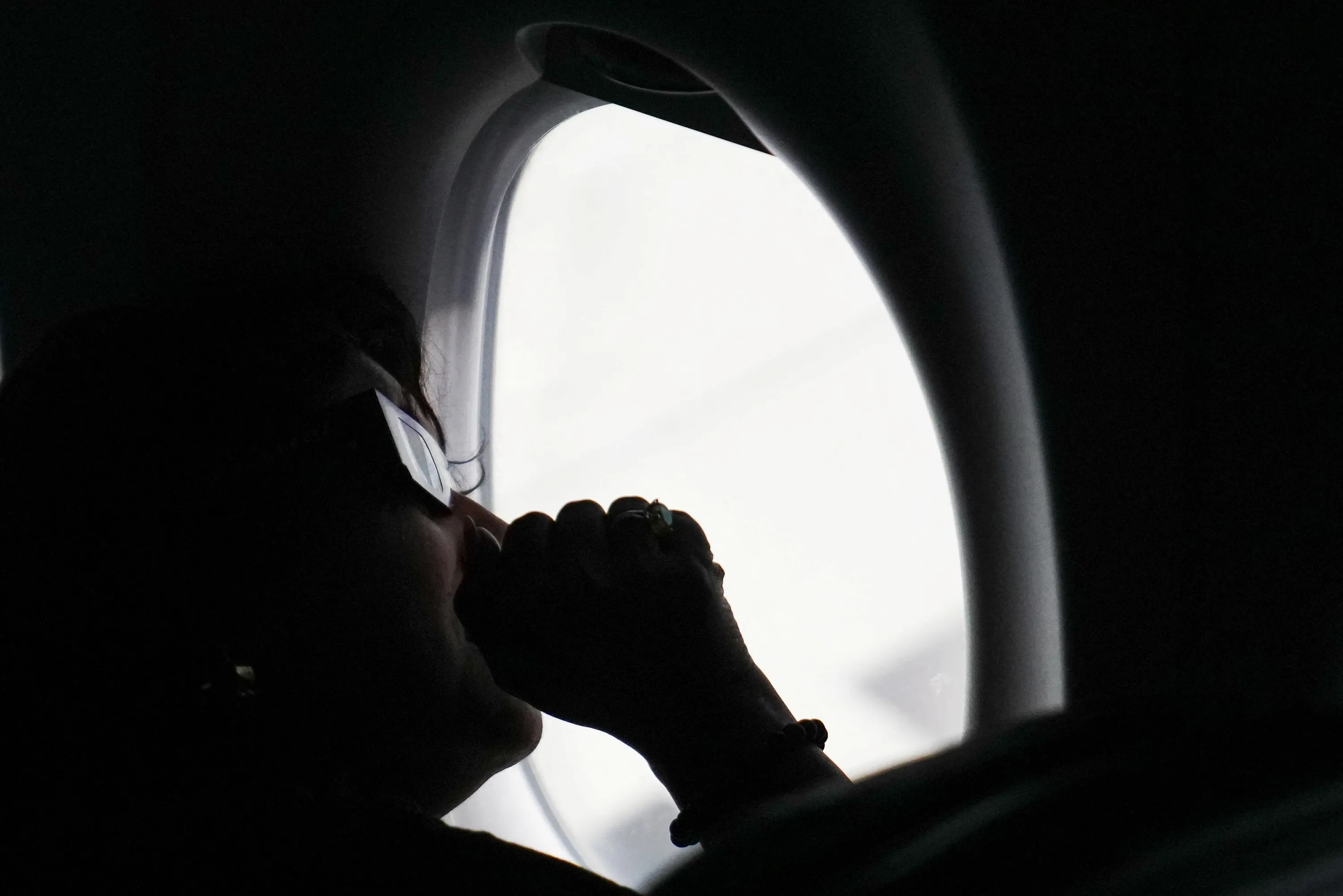 A passenger wears solar eclipse glasses as she looks from a special Delta Airlines eclipse flight over the skies of the U.S., April 8, 2024. (Photo by Leonardo Benassatto/Reuters)