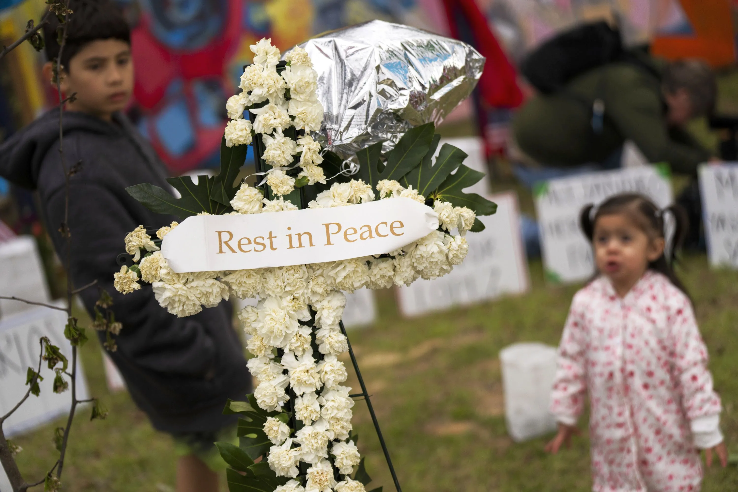 Small children run and play through the various flowers and candles at the memorial site for the victims of the Francis Scott Key Bridge collapse, Saturday, April 6, 2024, in Baltimore. (Photo by Kaitlin Newman/The Baltimore Banner via AP Photo)